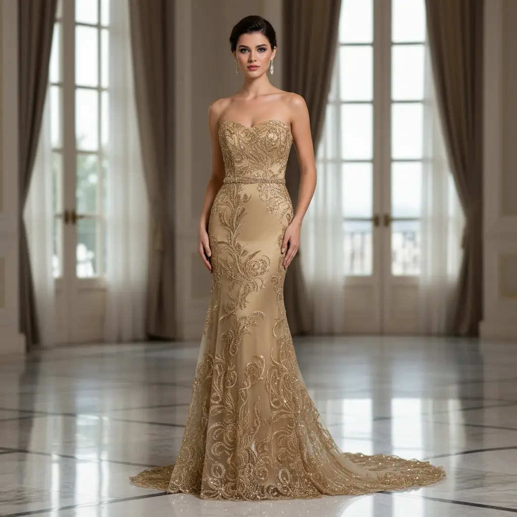 Tessuto tulle-pizzo ricamato con paillettes ideale per realizzare capi da cerimonia esclusivi ed eleganti.
