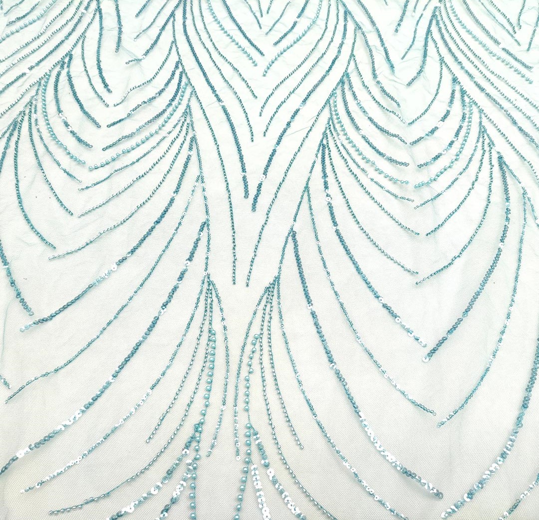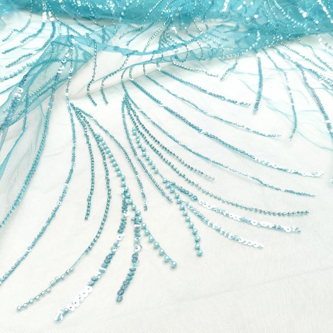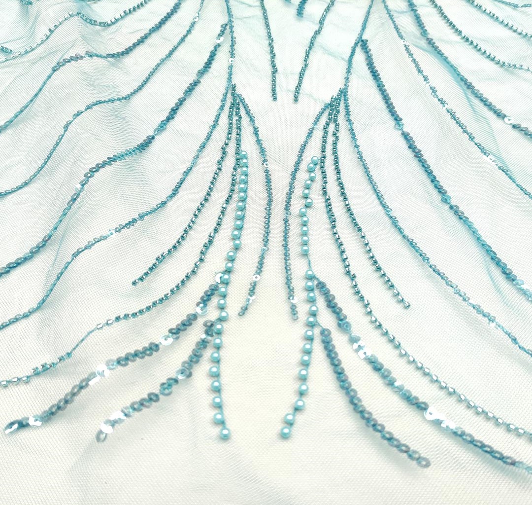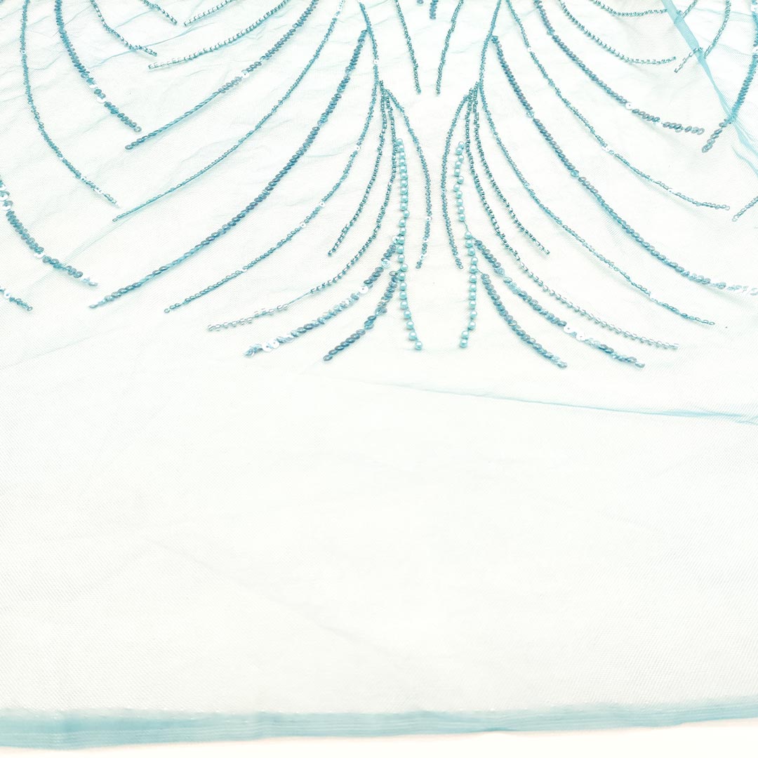 Tessuto Tulle mano seta ricamato con paillettes e con perline motivo astratto verde ottanio