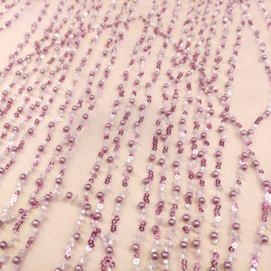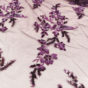 Tessuto Tulle mano seta ricamato con perline e paillettes motivo astratto lilla