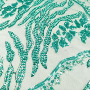€35,00Il prezzo originale era: €35,00.€22,00Il prezzo attuale è: €22,00. al metroTessuto Tulle mano seta ricamato con perline e paillettes motivo astratto smeraldo