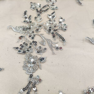 €35,00Il prezzo originale era: €35,00.€22,00Il prezzo attuale è: €22,00. al metroTessuto Tulle mano seta ricamato con perline e paillettes motivo floreale argento