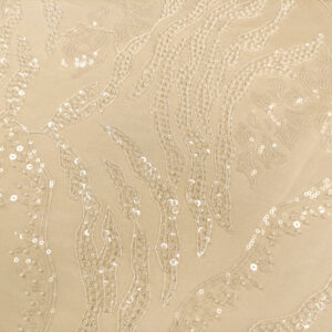 €45,00Il prezzo originale era: €45,00.€34,00Il prezzo attuale è: €34,00. al metroTessuto Tulle mano seta ricamato con perline e paillettes motivo astratto bianco seta