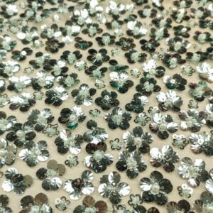 €35,00Il prezzo originale era: €35,00.€25,00Il prezzo attuale è: €25,00. al metroTessuto Tulle mano seta ricamato paillettes motivo floreale salvia