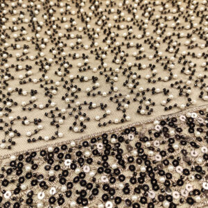 €35,00Il prezzo originale era: €35,00.€25,00Il prezzo attuale è: €25,00. al metroTessuto Tulle mano seta ricamato con perle e pietre motivo astratto bianco – nero