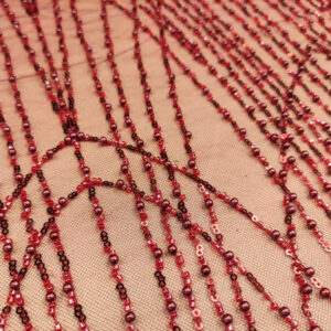 €35,00Il prezzo originale era: €35,00.€25,00Il prezzo attuale è: €25,00. al metroTessuto Tulle mano seta ricamato con perle e pietre motivo astratto rosso