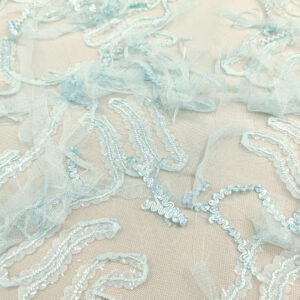 €35,00Il prezzo originale era: €35,00.€15,00Il prezzo attuale è: €15,00. al metroTessuto Tulle mano seta ricamato motivo astratto 3d celeste