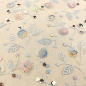 €35,00Il prezzo originale era: €35,00.€15,00Il prezzo attuale è: €15,00. al metroTessuto Tulle mano seta ricamato motivo floreale celeste