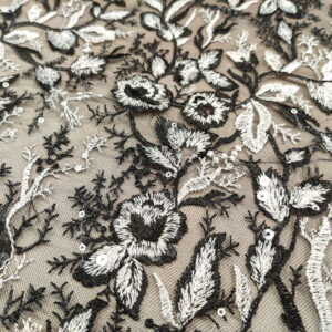€30,00Il prezzo originale era: €30,00.€14,00Il prezzo attuale è: €14,00. al metroTessuto Tulle mano seta ricamato motivo floreale bianco – nero