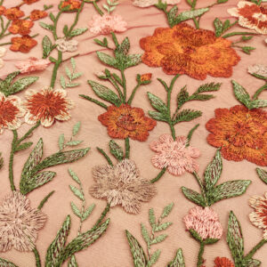 €35,00Il prezzo originale era: €35,00.€20,00Il prezzo attuale è: €20,00. al metroTessuto Tulle mano seta ricamato motivo floreale rosa – verde – arancione