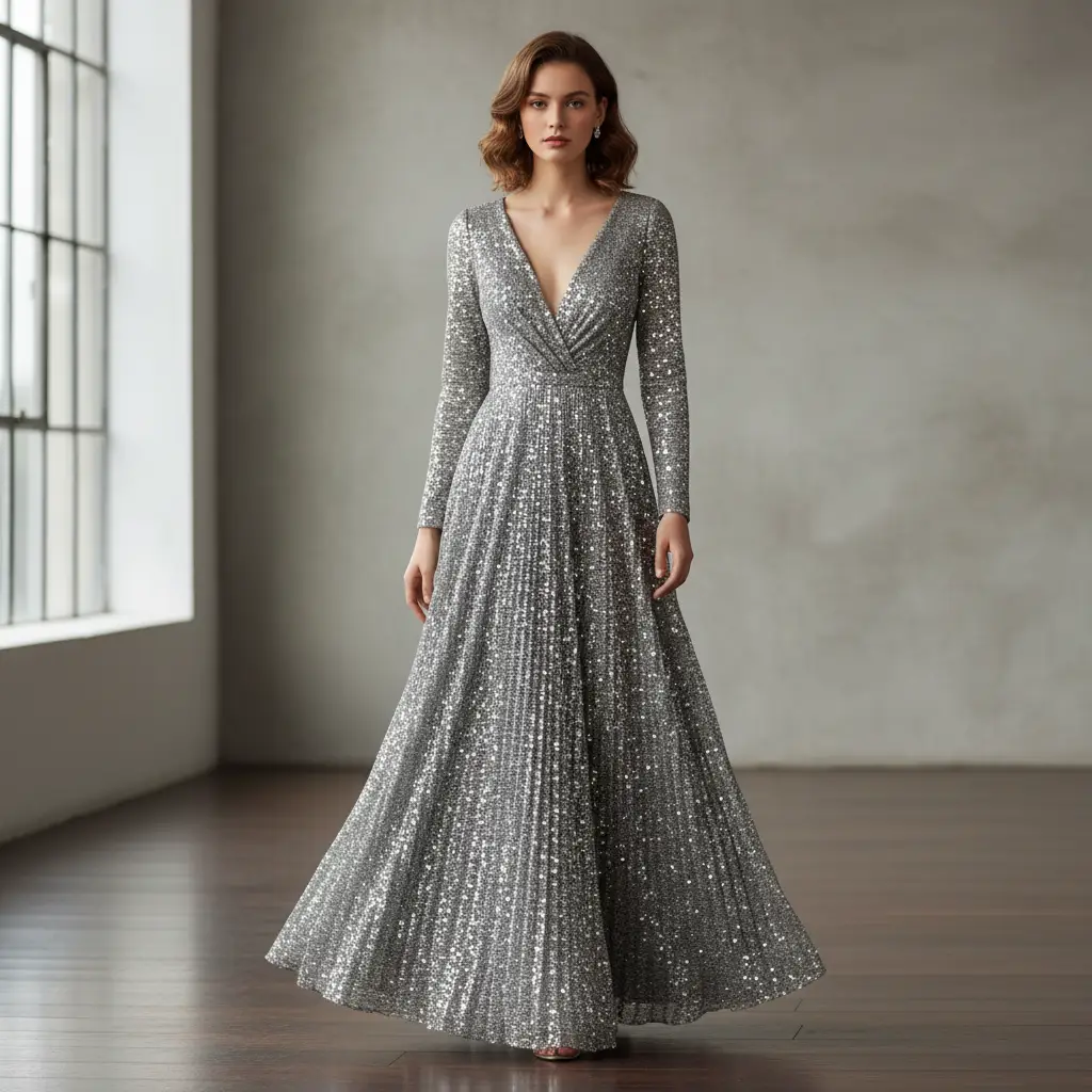 Tessuto jersey plissè Ricamato con paillettes tinta unita argento