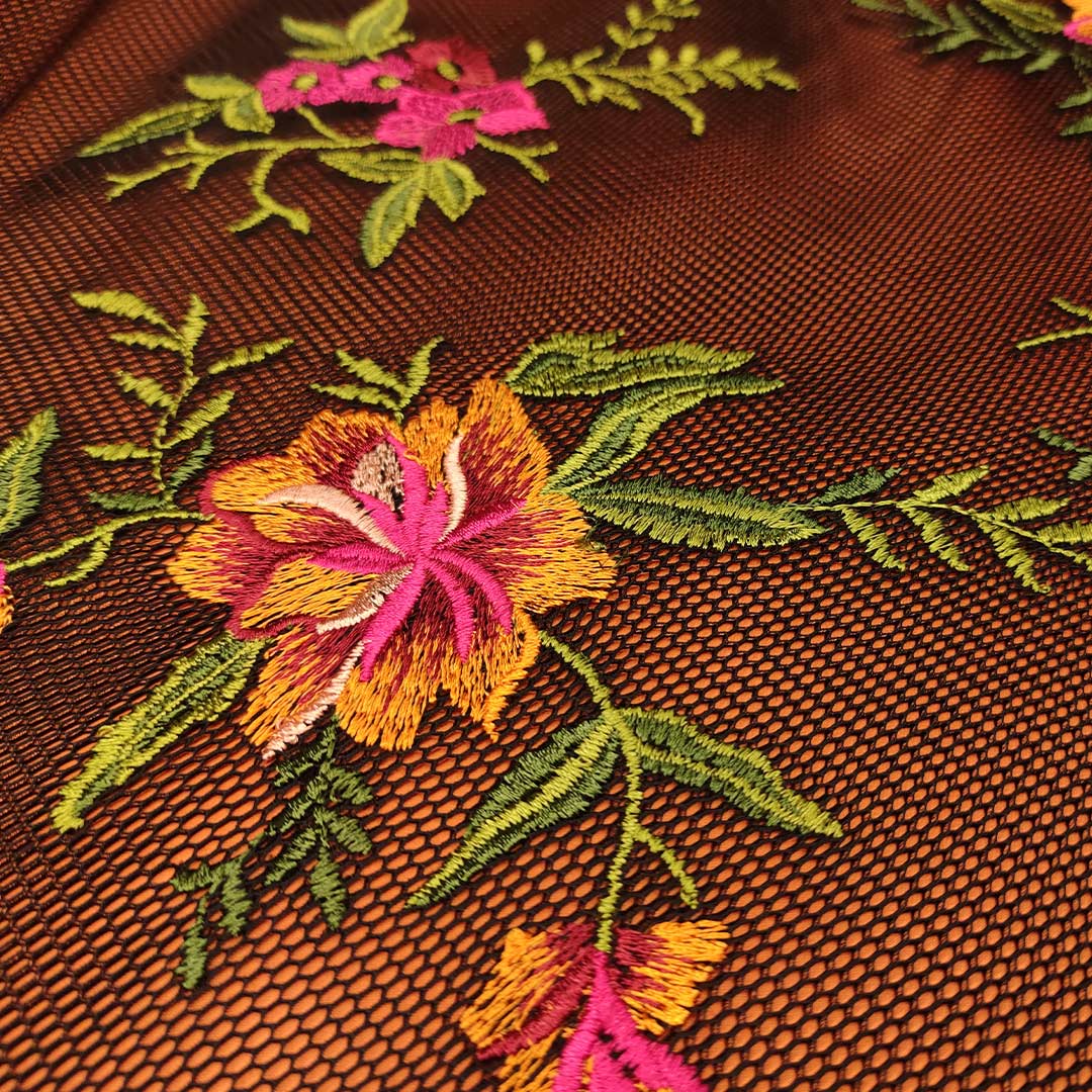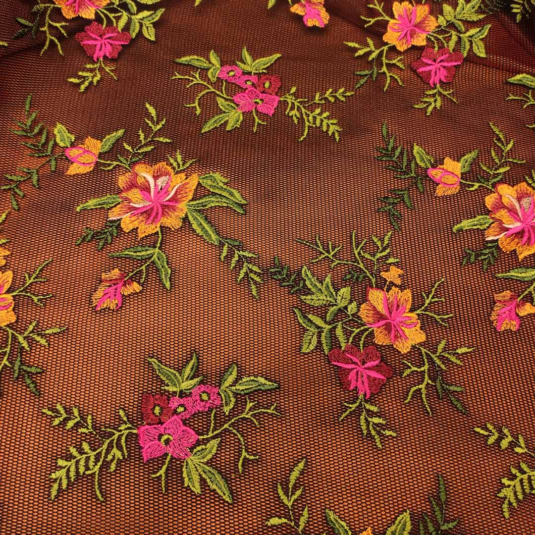 Tessuto tulle a rete ricamato con fiori fucsia – arancione – verde