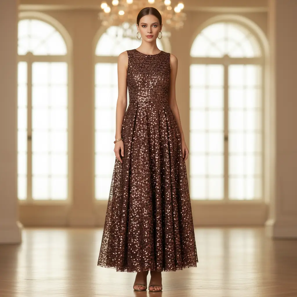 Tessuto Tulle Elasticizzato Ricamato con paillettes marrone