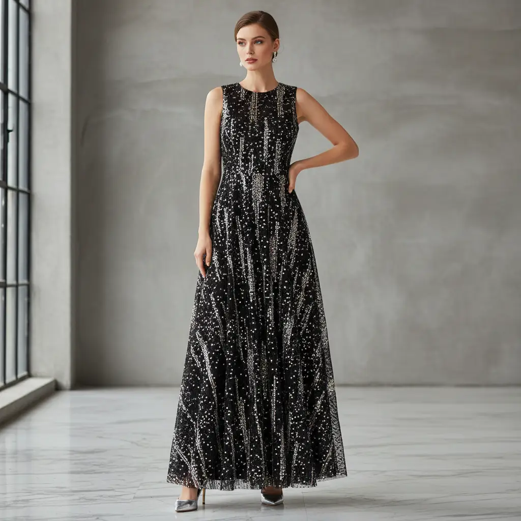 Tessuto Tulle elasticizzato ricamato con paillettes ideale per creare capi eleganti e brillanti.
