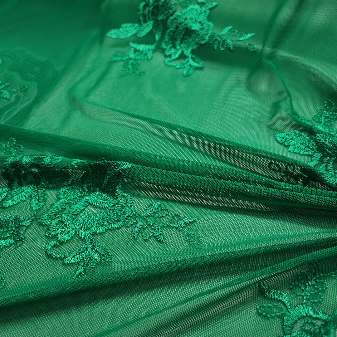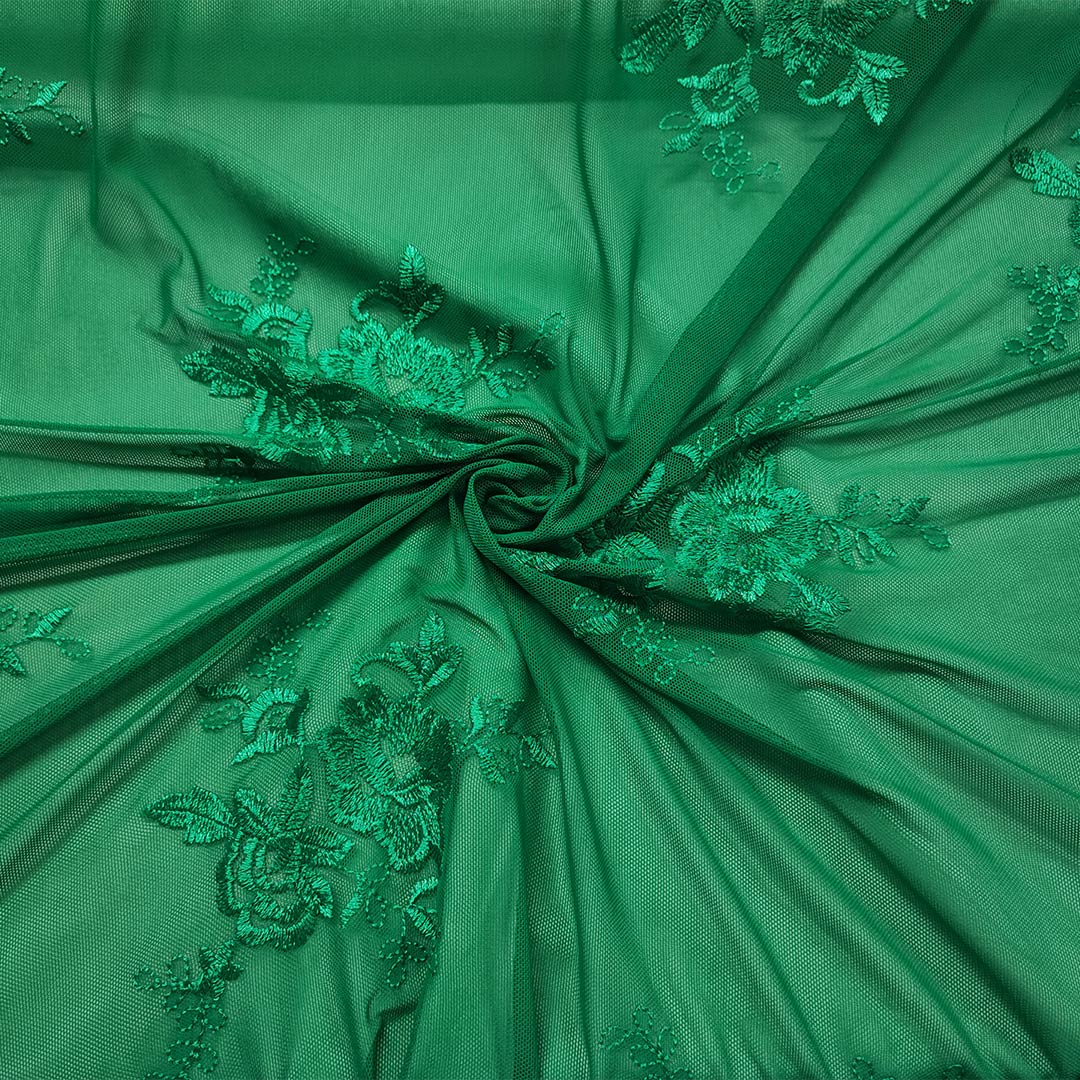 Tessuto Tulle elasticizzato ricamato motivo floreale verde prato