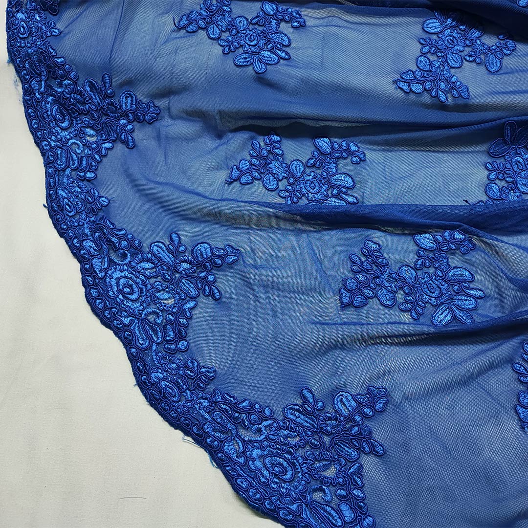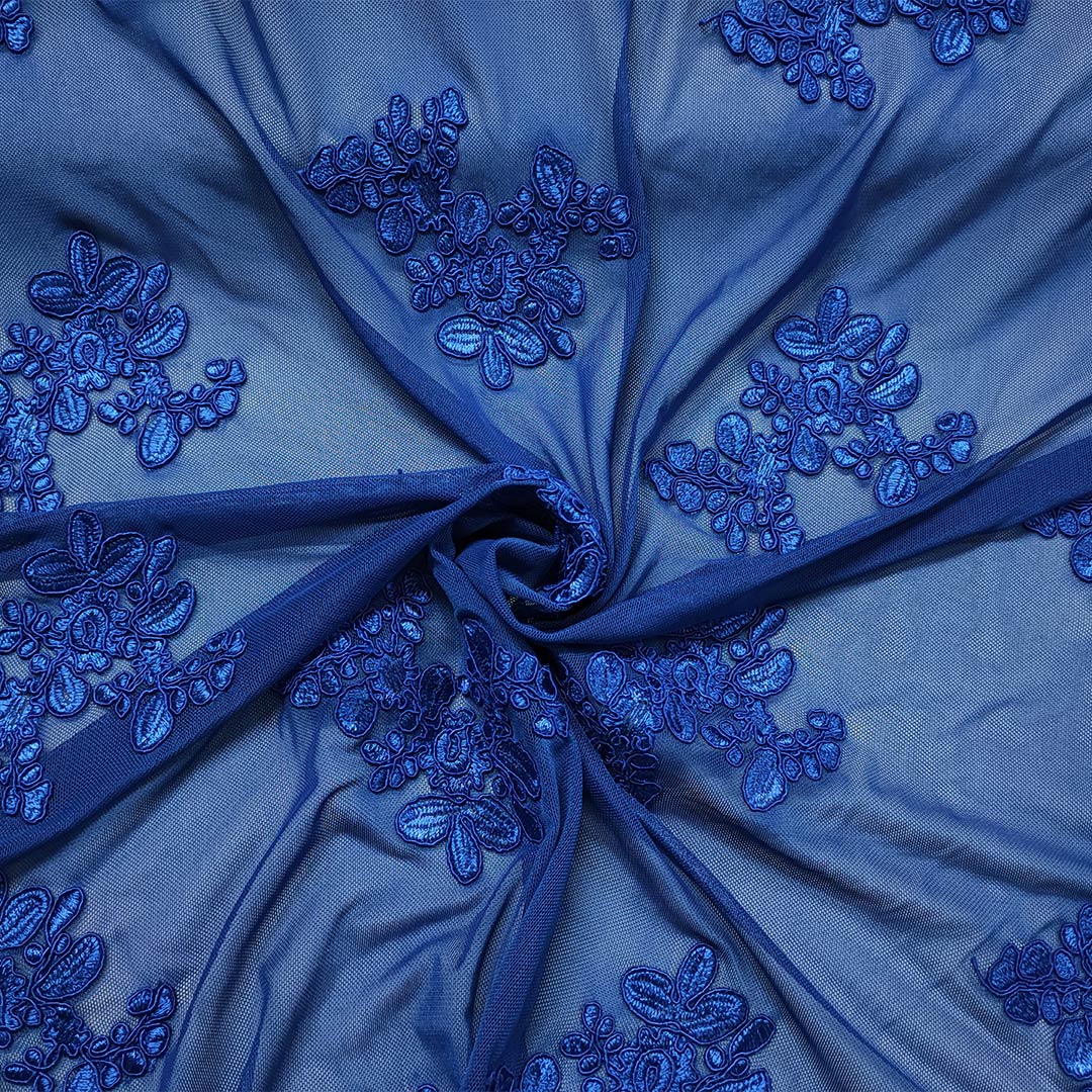 Tessuto Tulle elasticizzato ricamato smerlato motivo floreale bluette