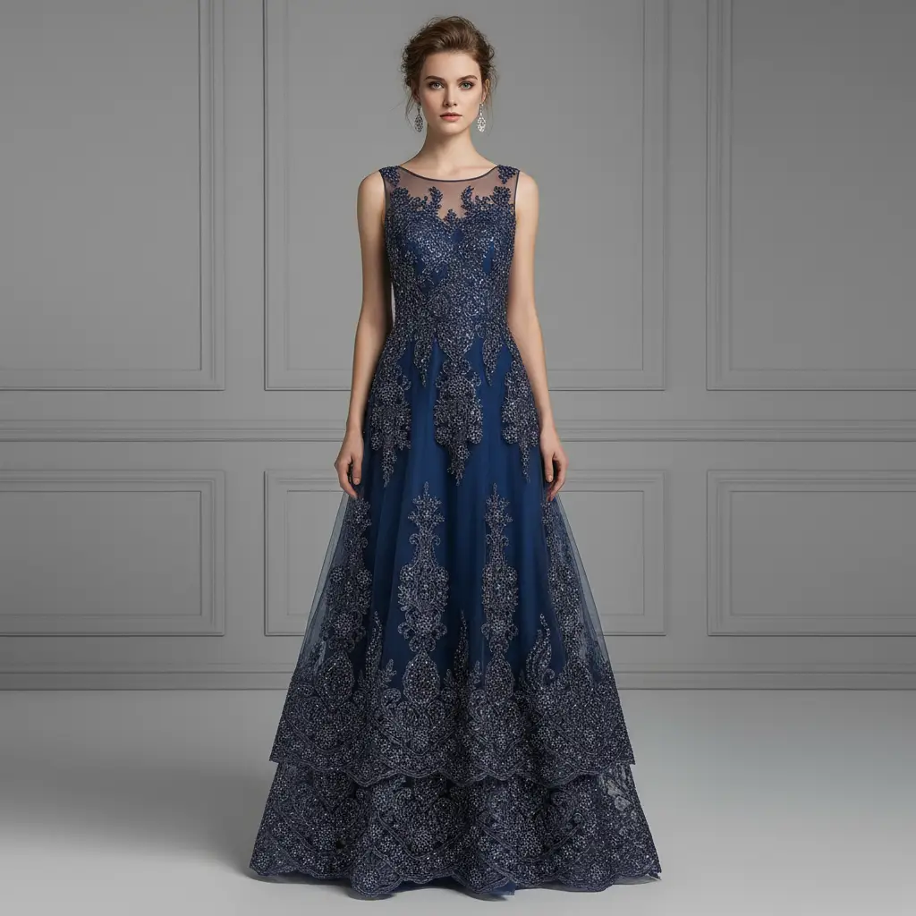 Tessuto Tulle mano seta doppio smerlo ricamato con paillettes e con perline motivo floreale arabo blu