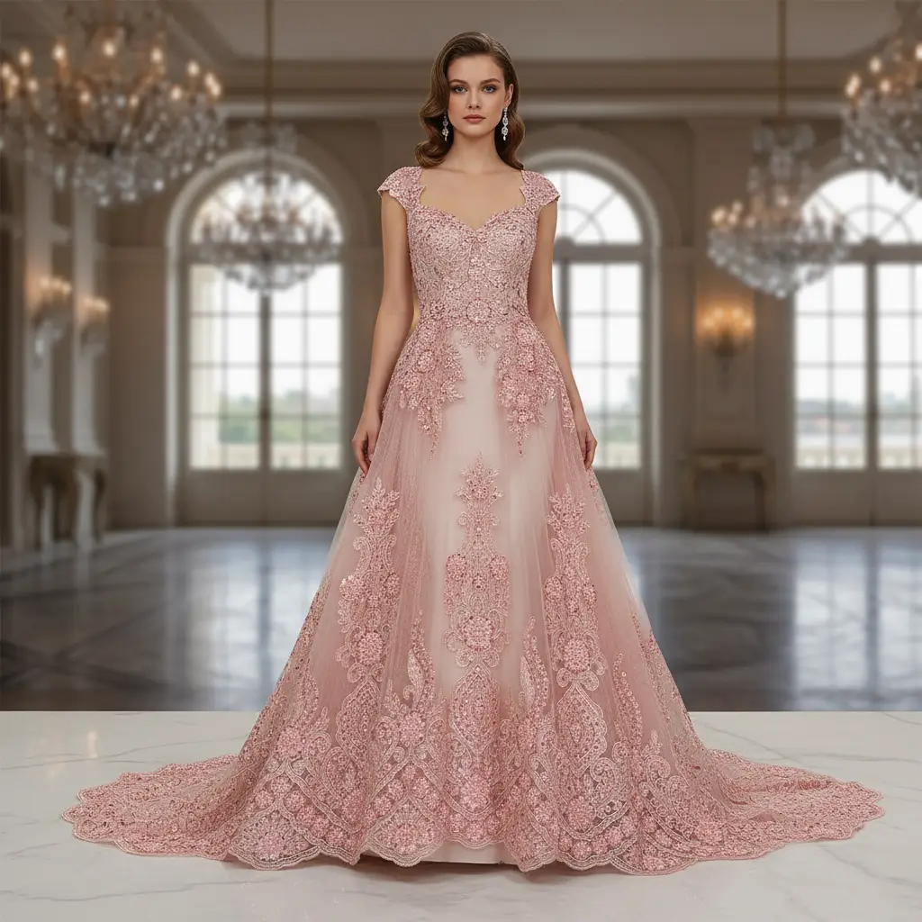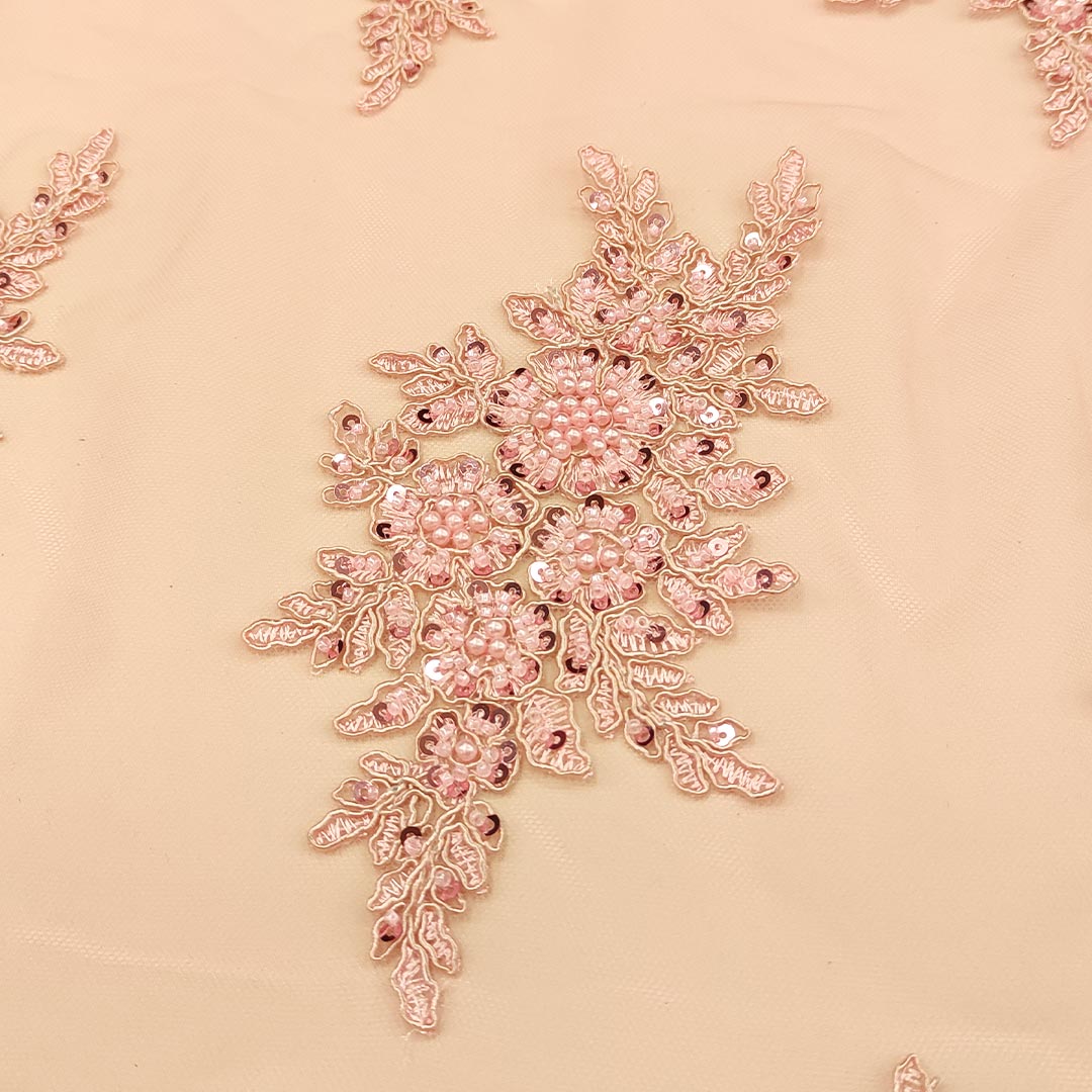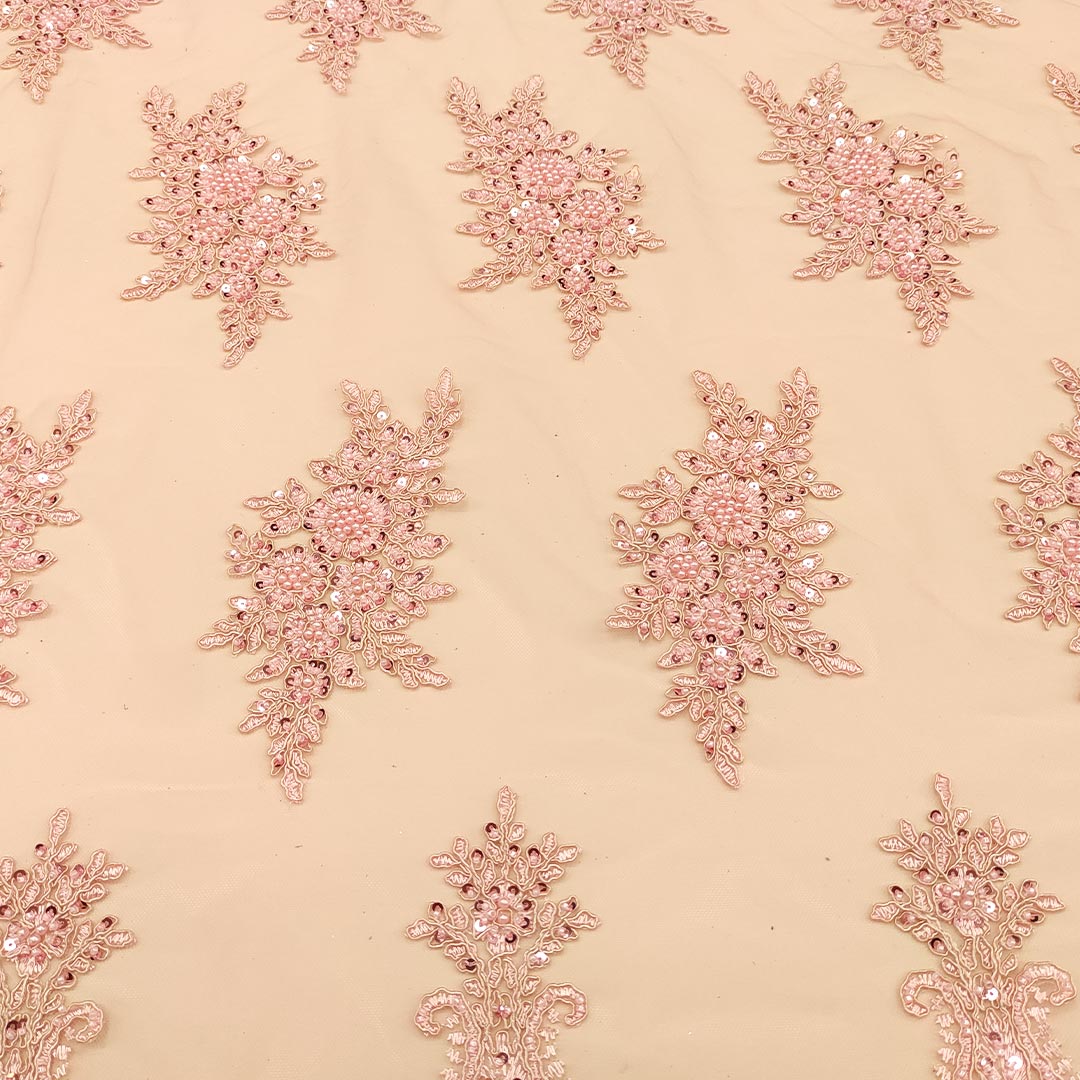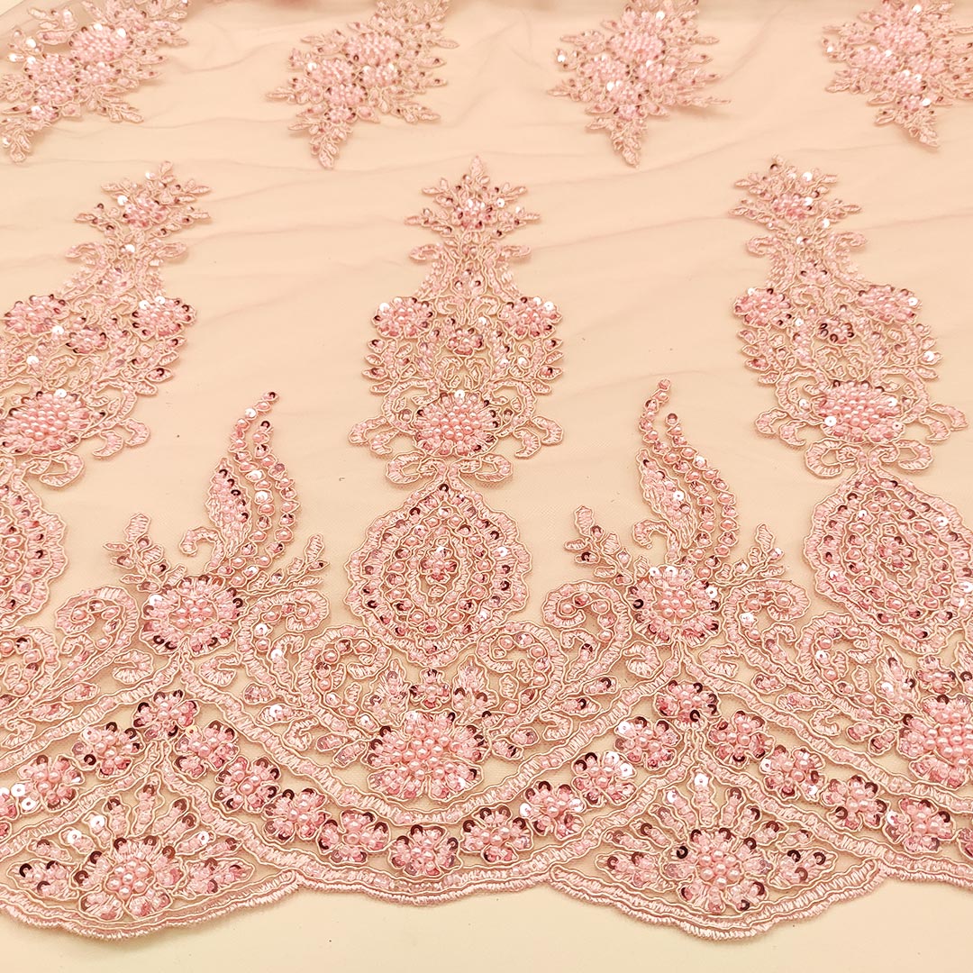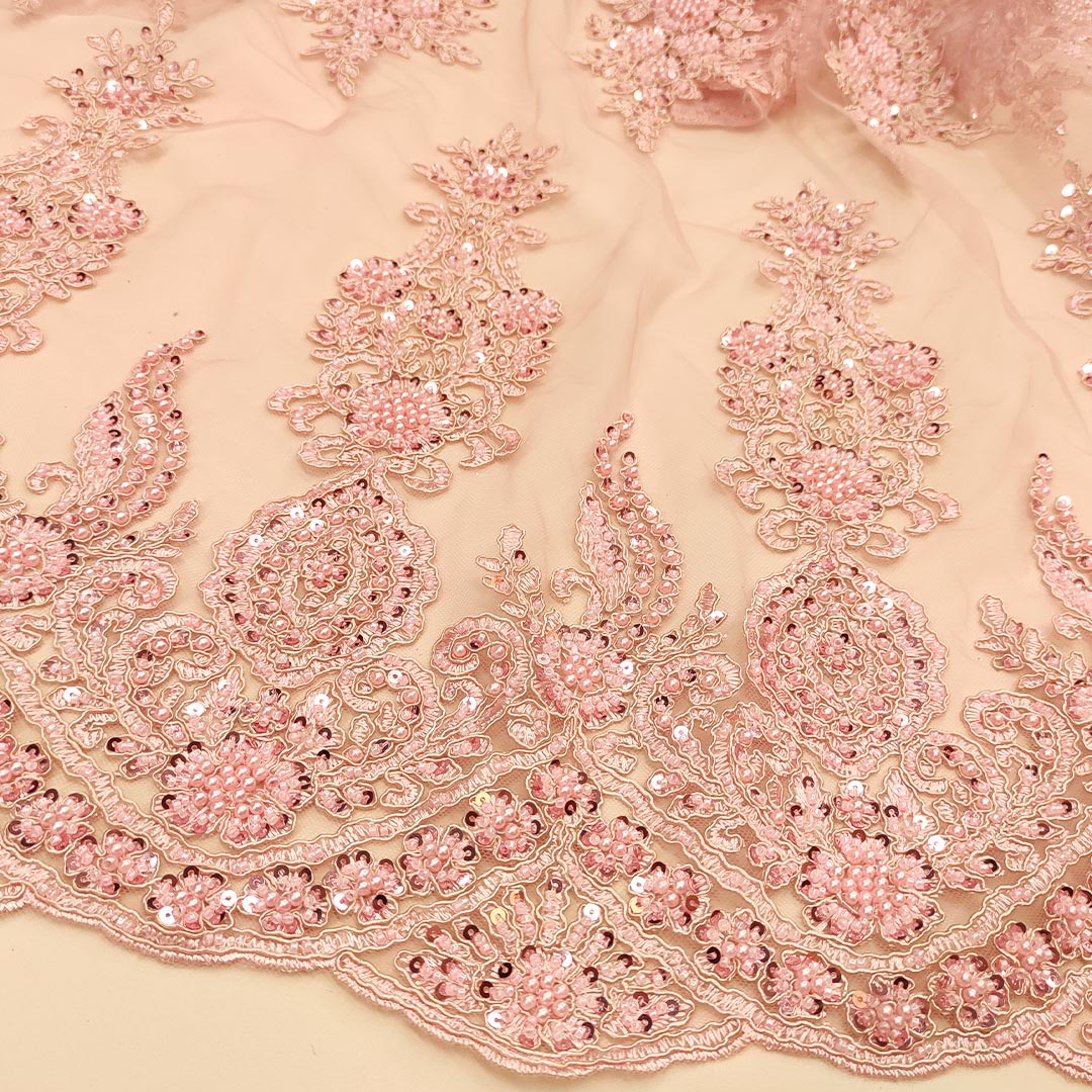 Tessuto Tulle mano seta doppio smerlo ricamato con paillettes e con perline motivo floreale arabo rosa