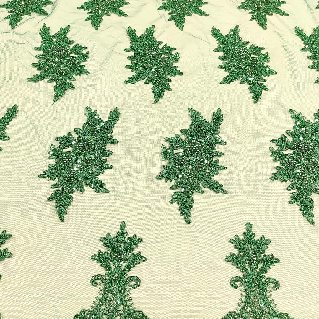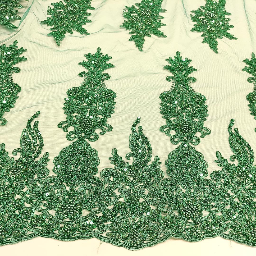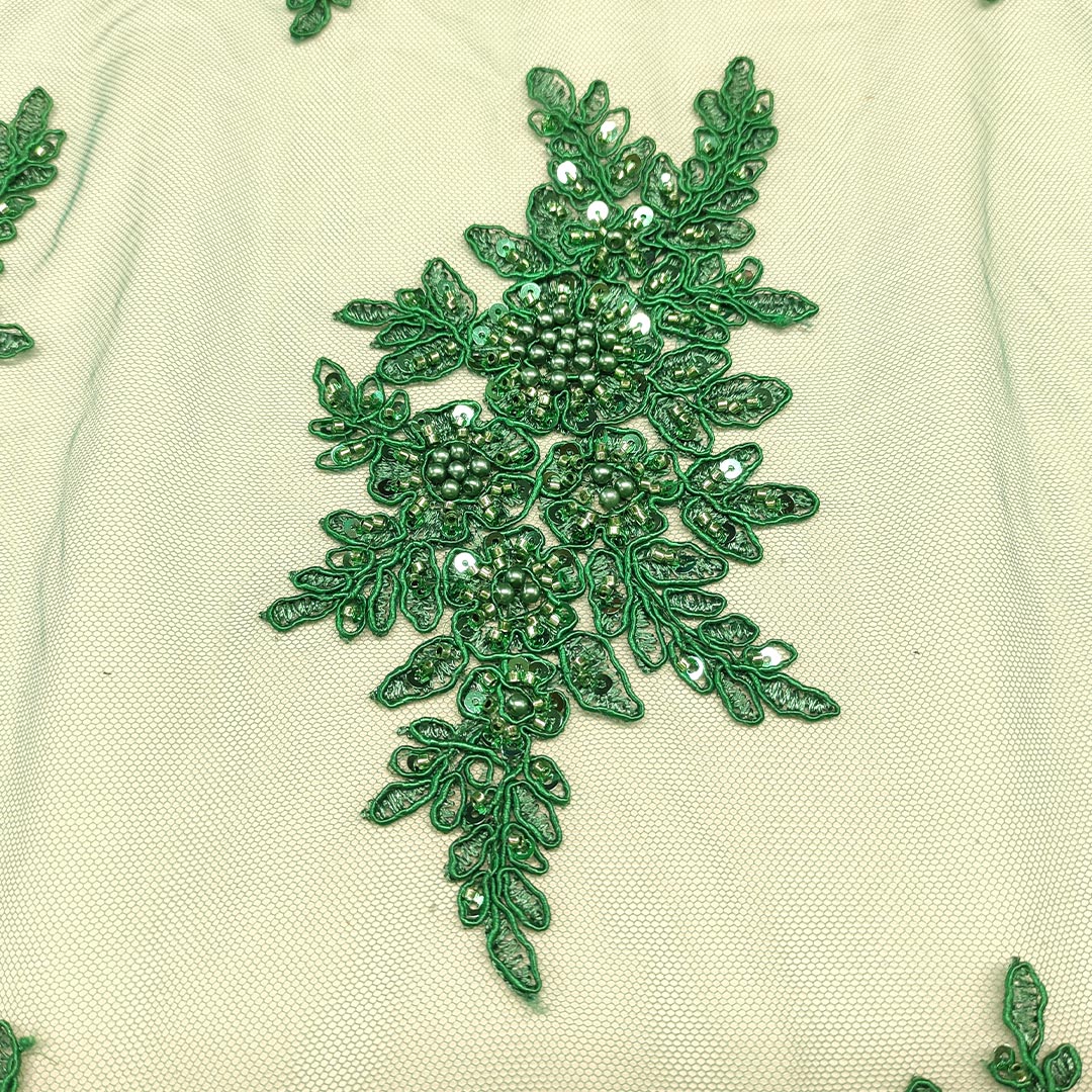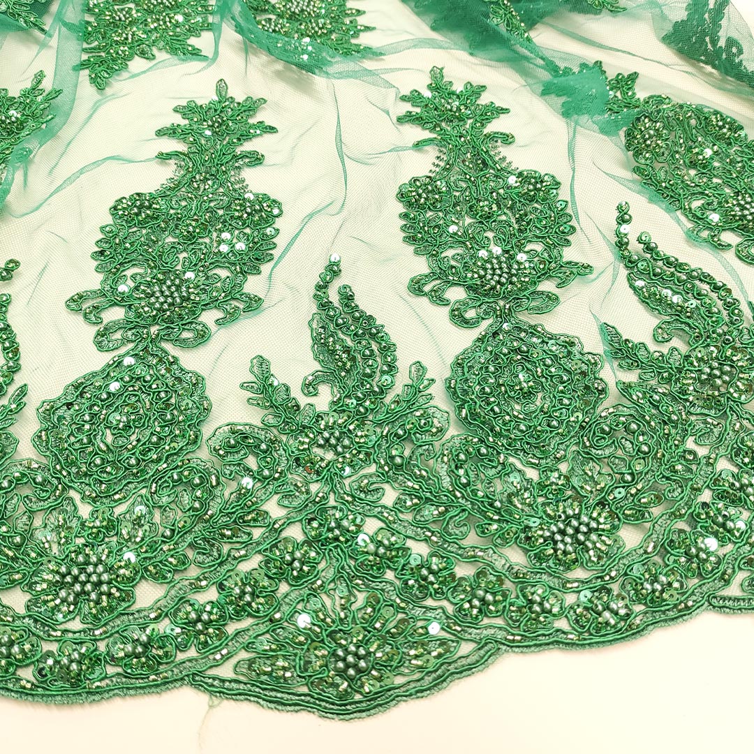 Tessuto Tulle mano seta doppio smerlo ricamato con paillettes e con perline motivo floreale arabo verde
