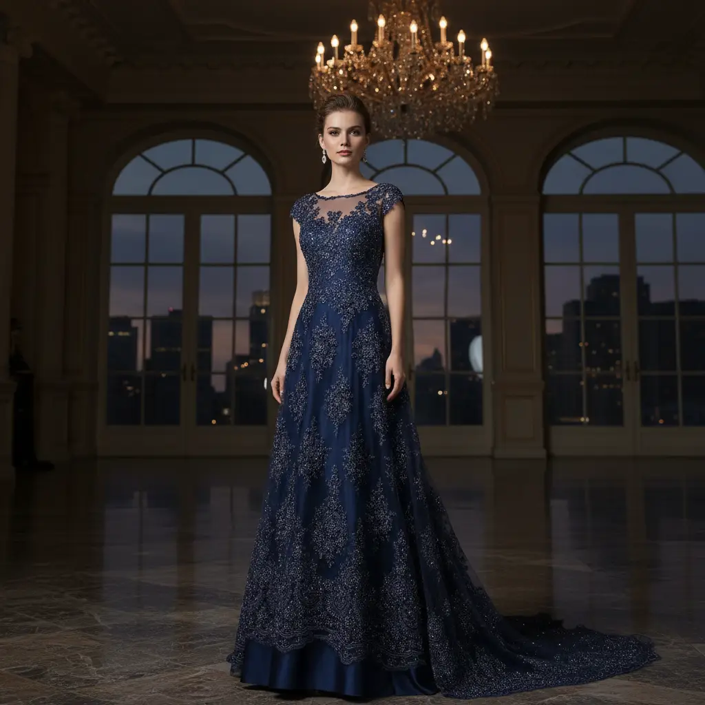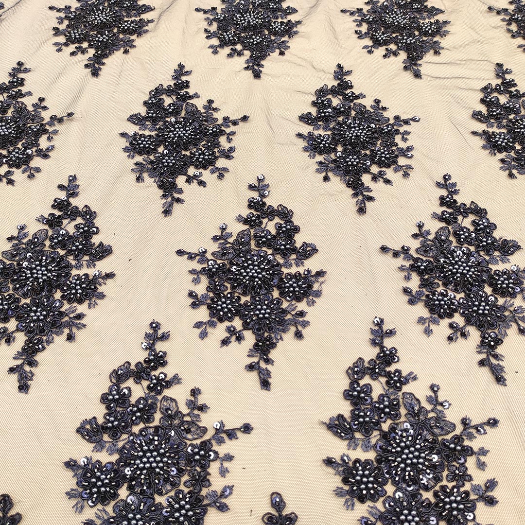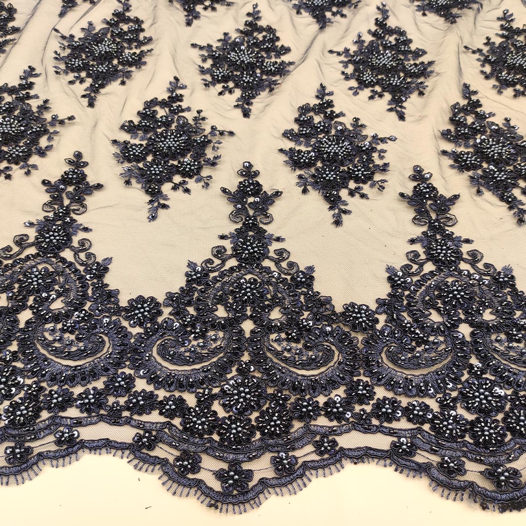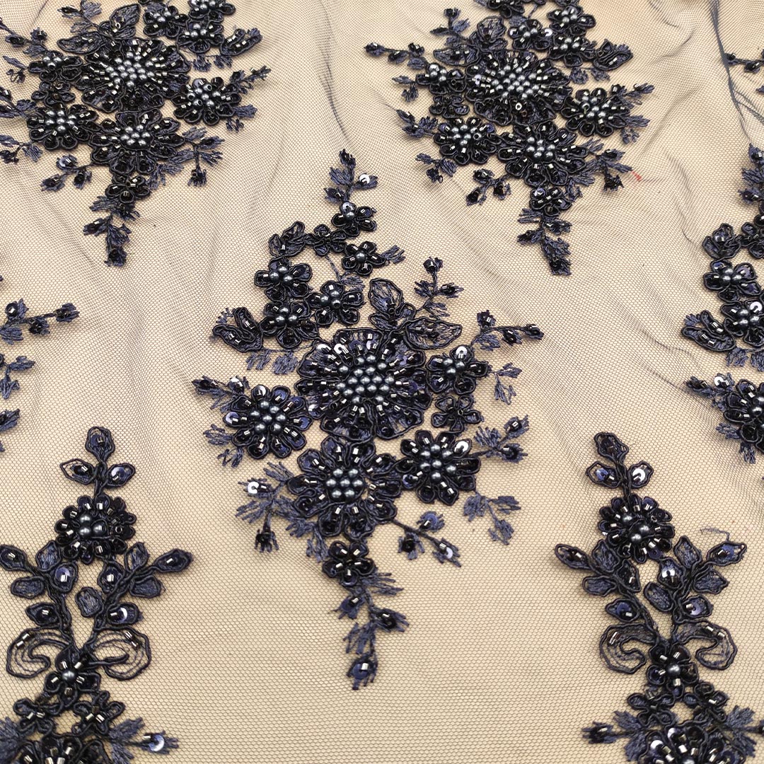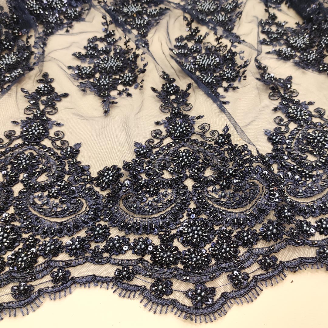 Tessuto Tulle mano seta doppio smerlo ricamato con paillettes e con perline motivo floreale barocco blu notte