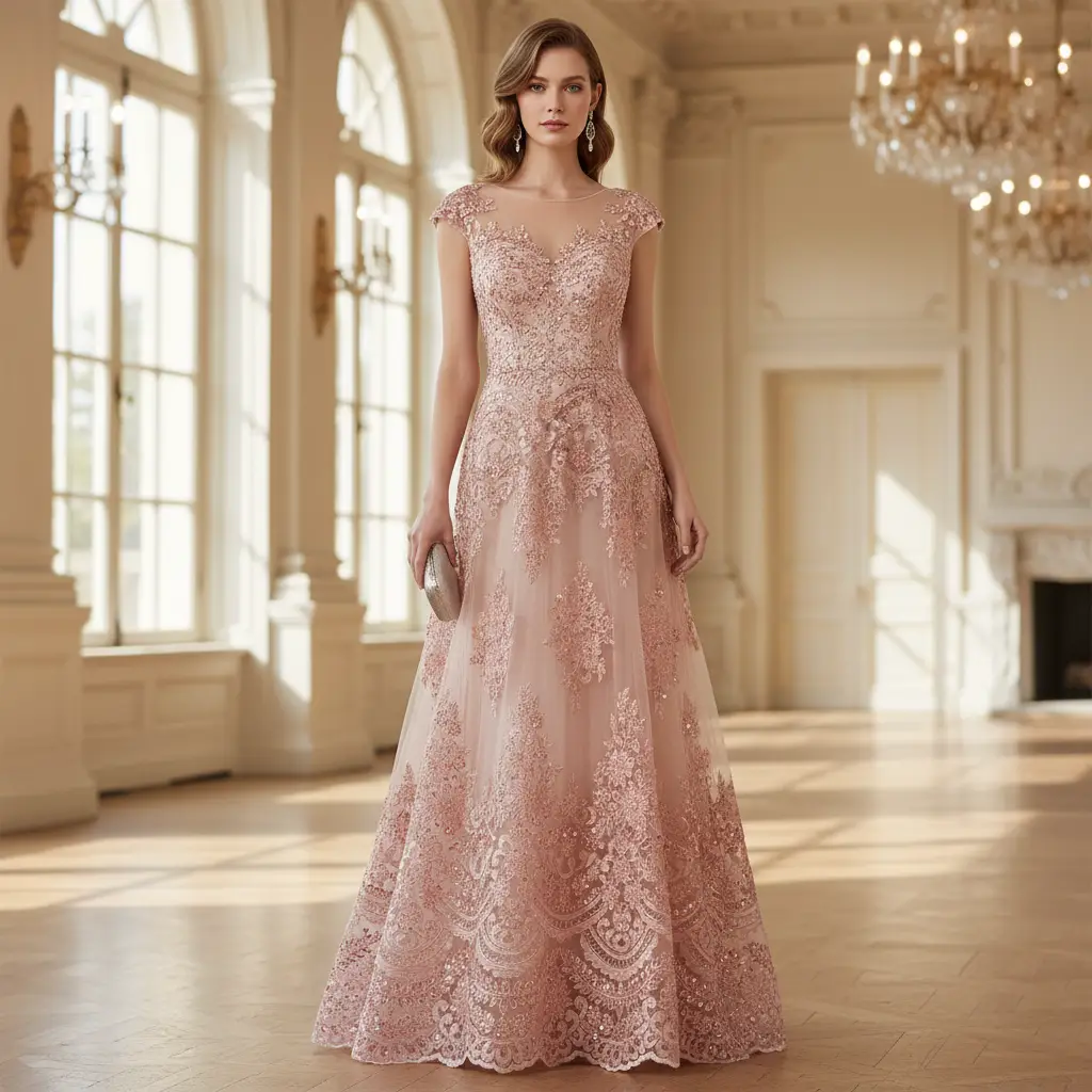 Tessuto Tulle mano seta doppio smerlo ricamato con paillettes e con perline motivo floreale barocco rosa