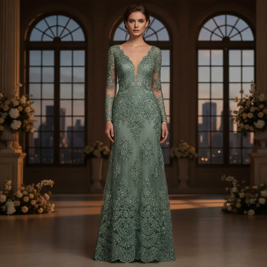 Tessuto Tulle mano seta doppio smerlo ricamato con paillettes e con perline motivo floreale barocco verde salvia