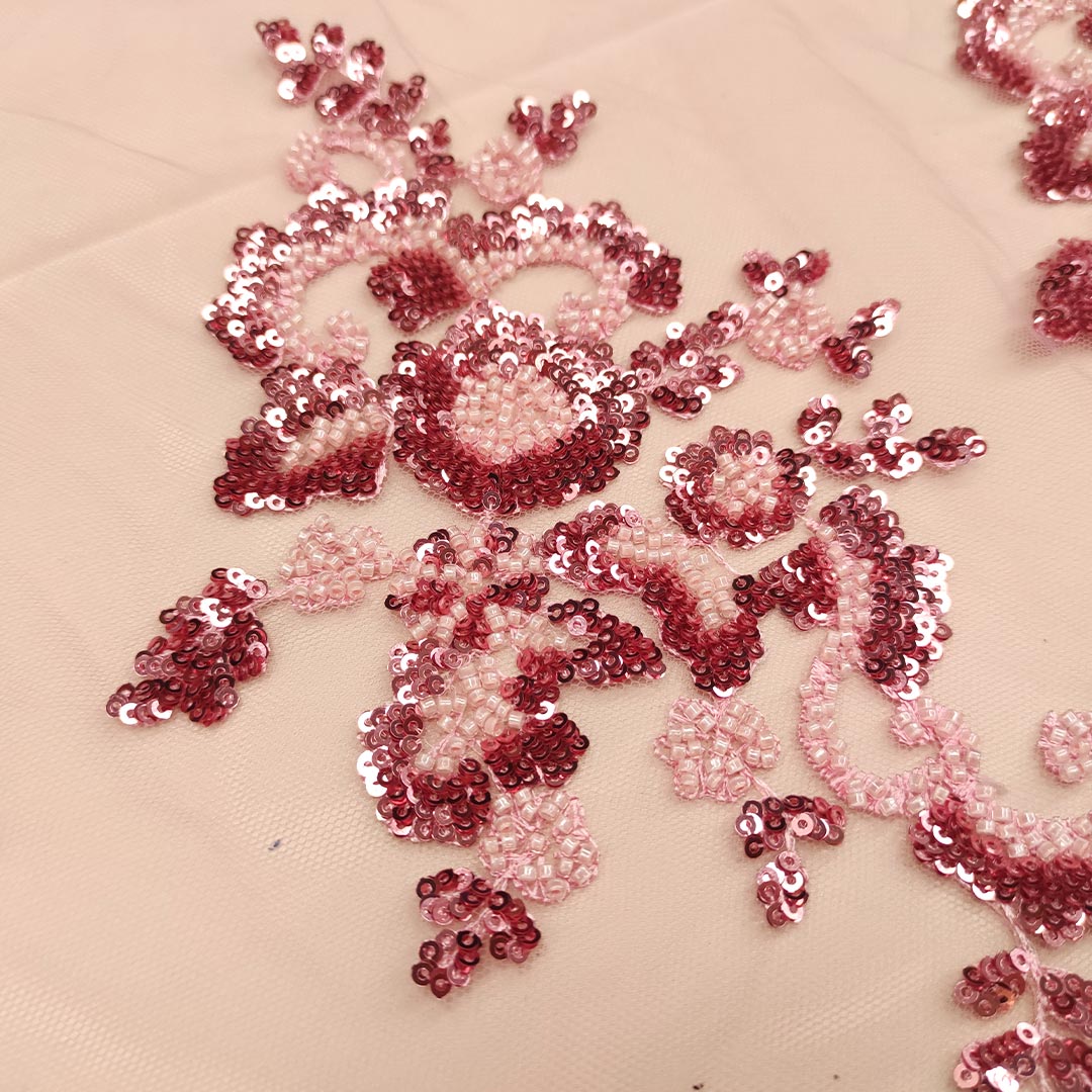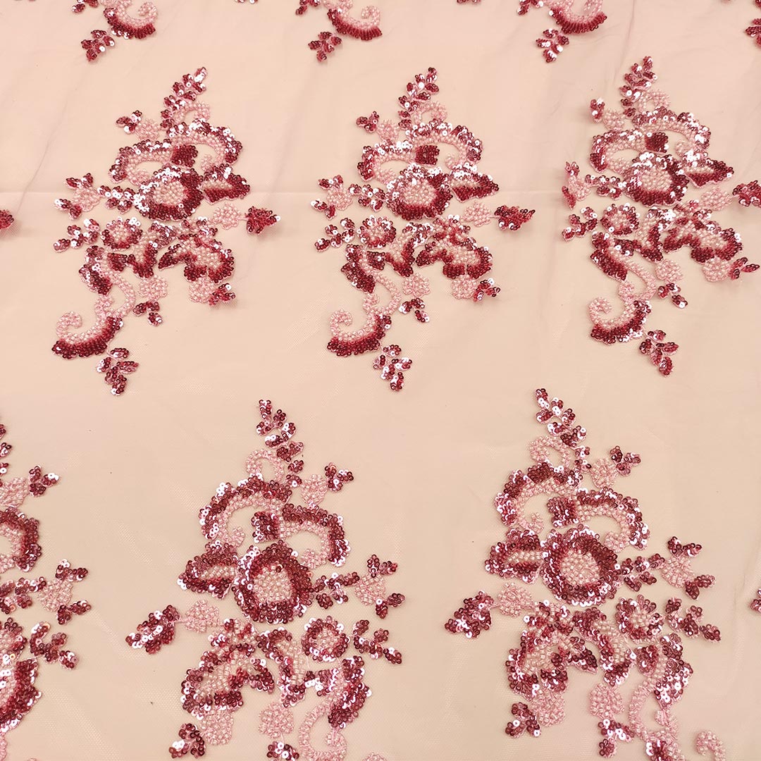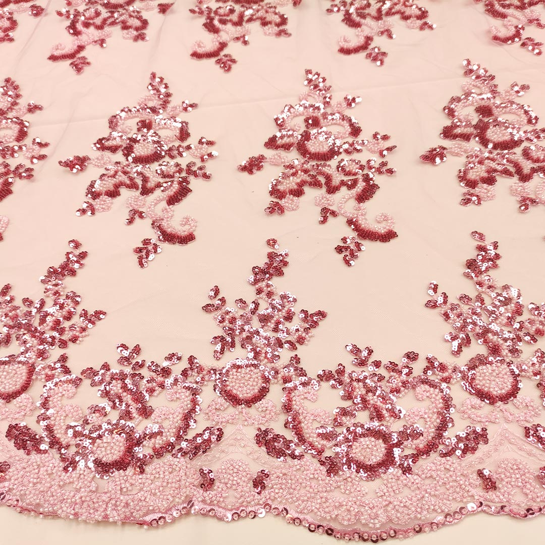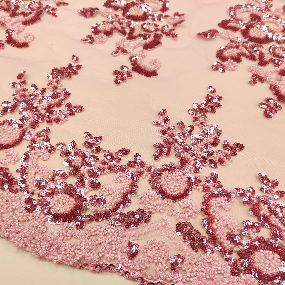 Tessuto Tulle mano seta doppio smerlo ricamato con paillettes e con perline motivo floreale rosa