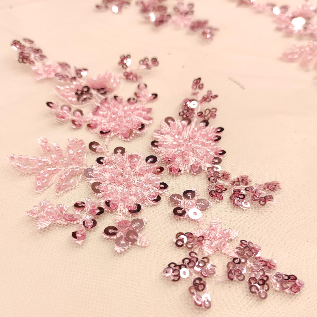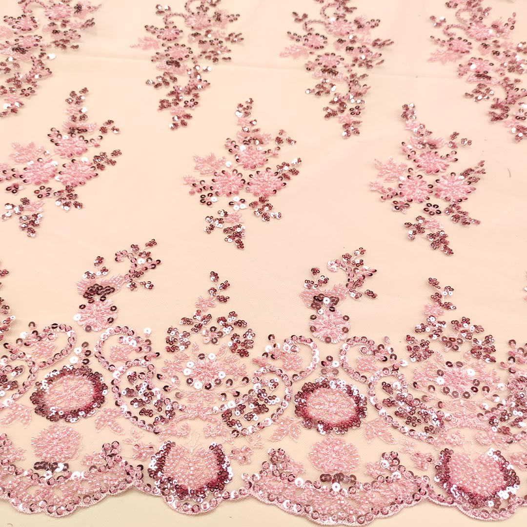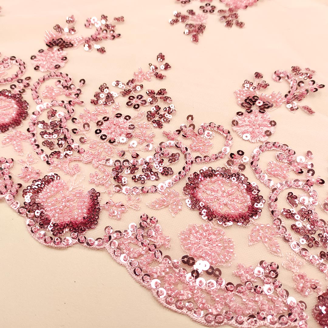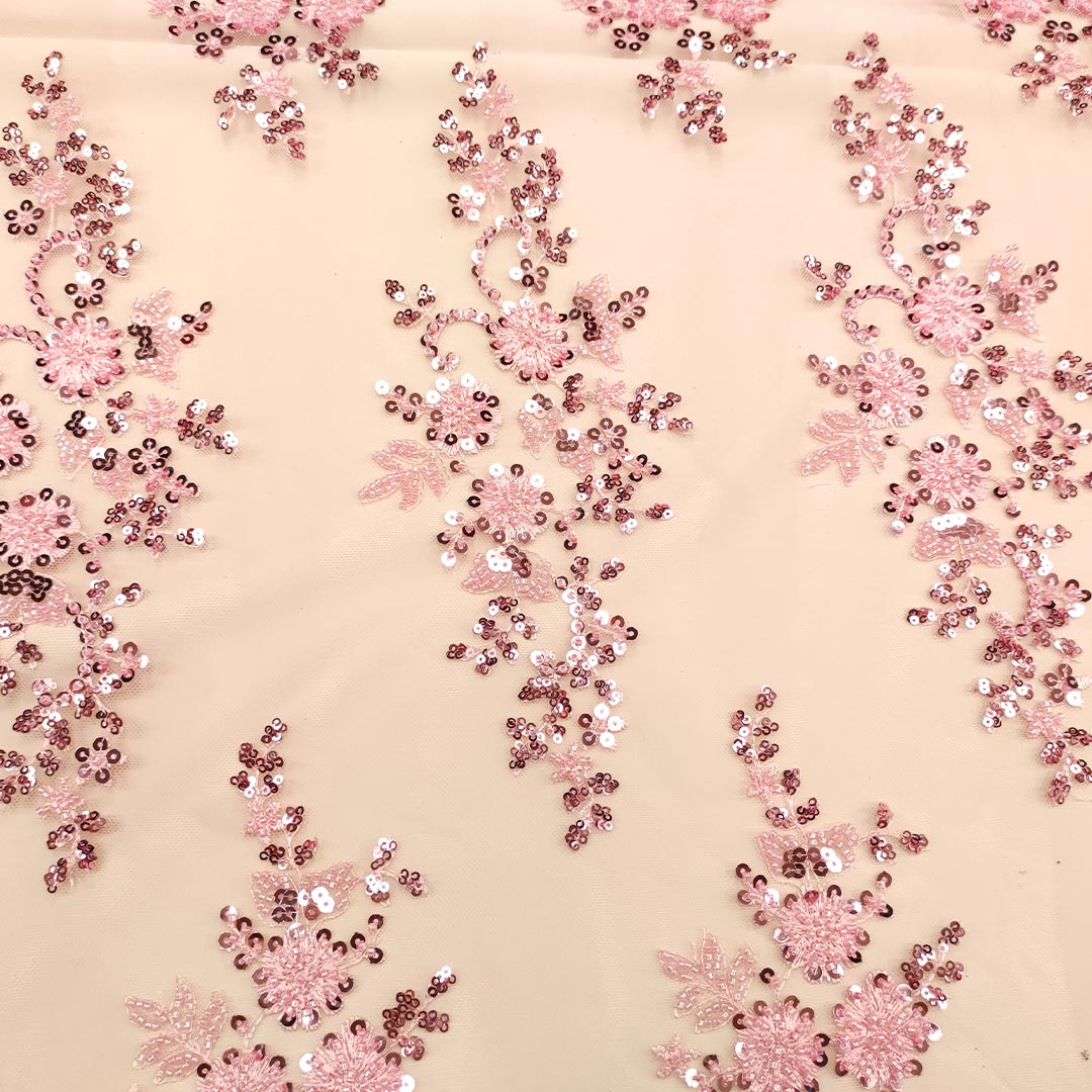 Tessuto Tulle mano seta doppio smerlo ricamato con paillettes e con perline motivo floreale rosa