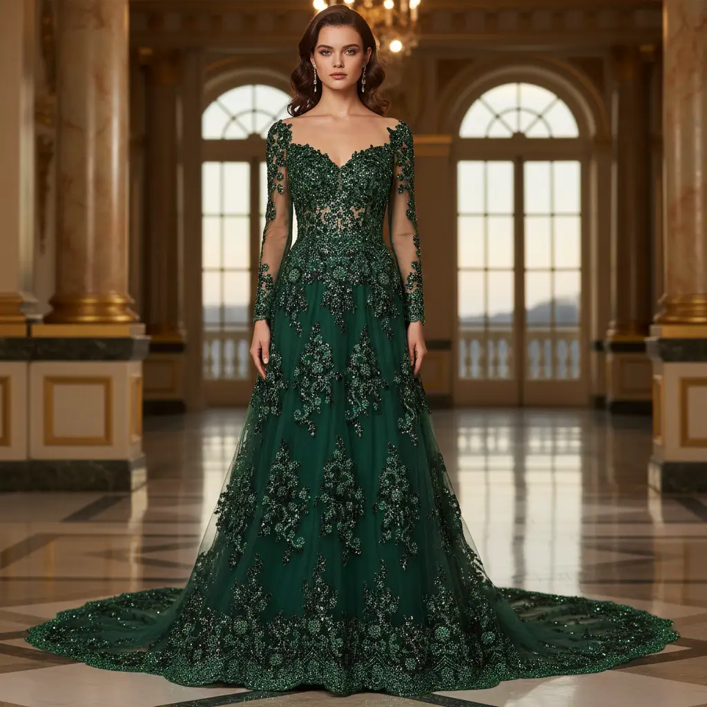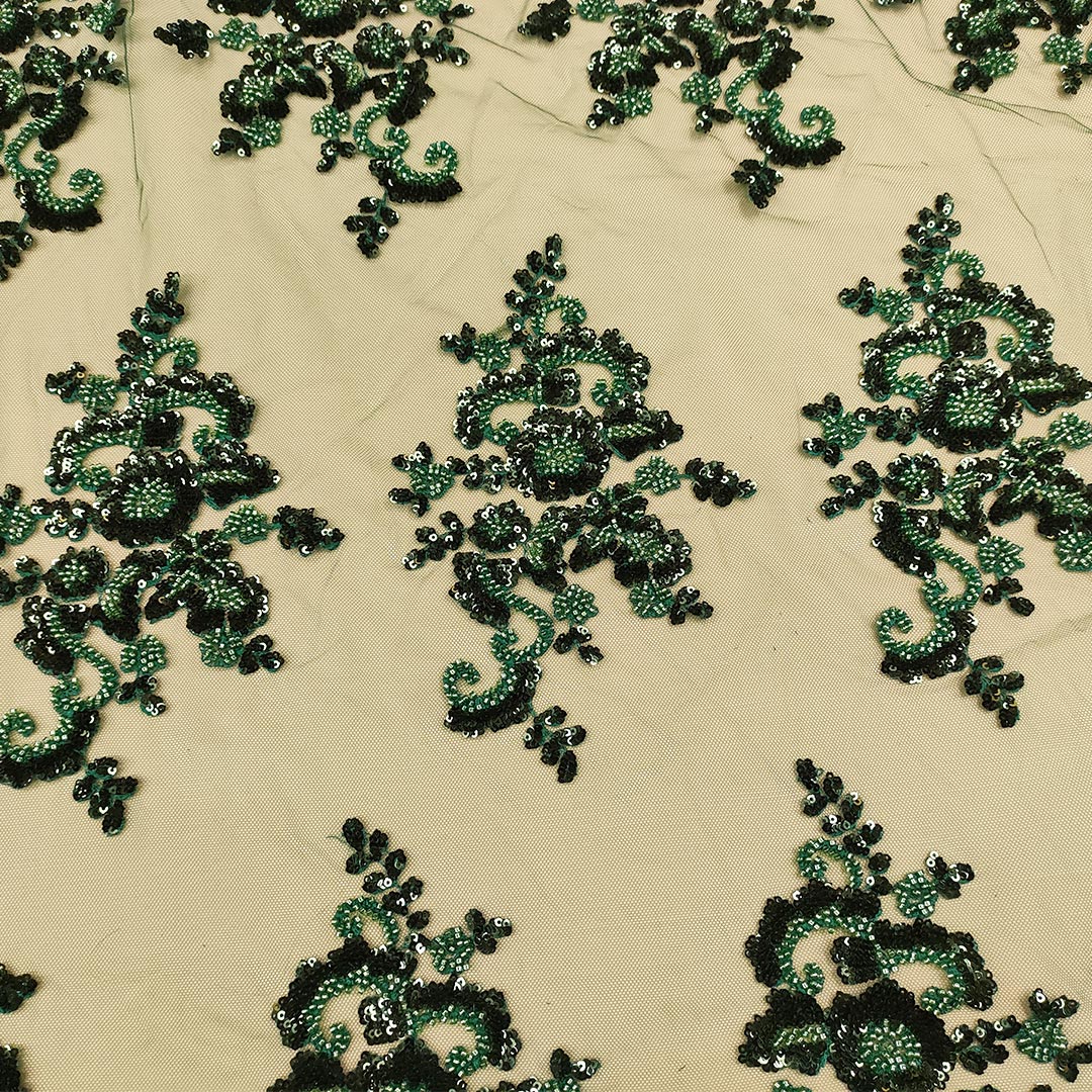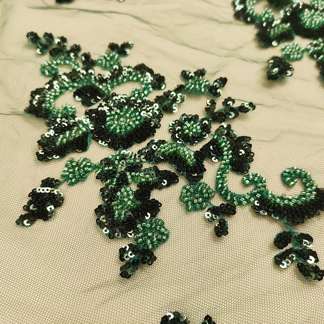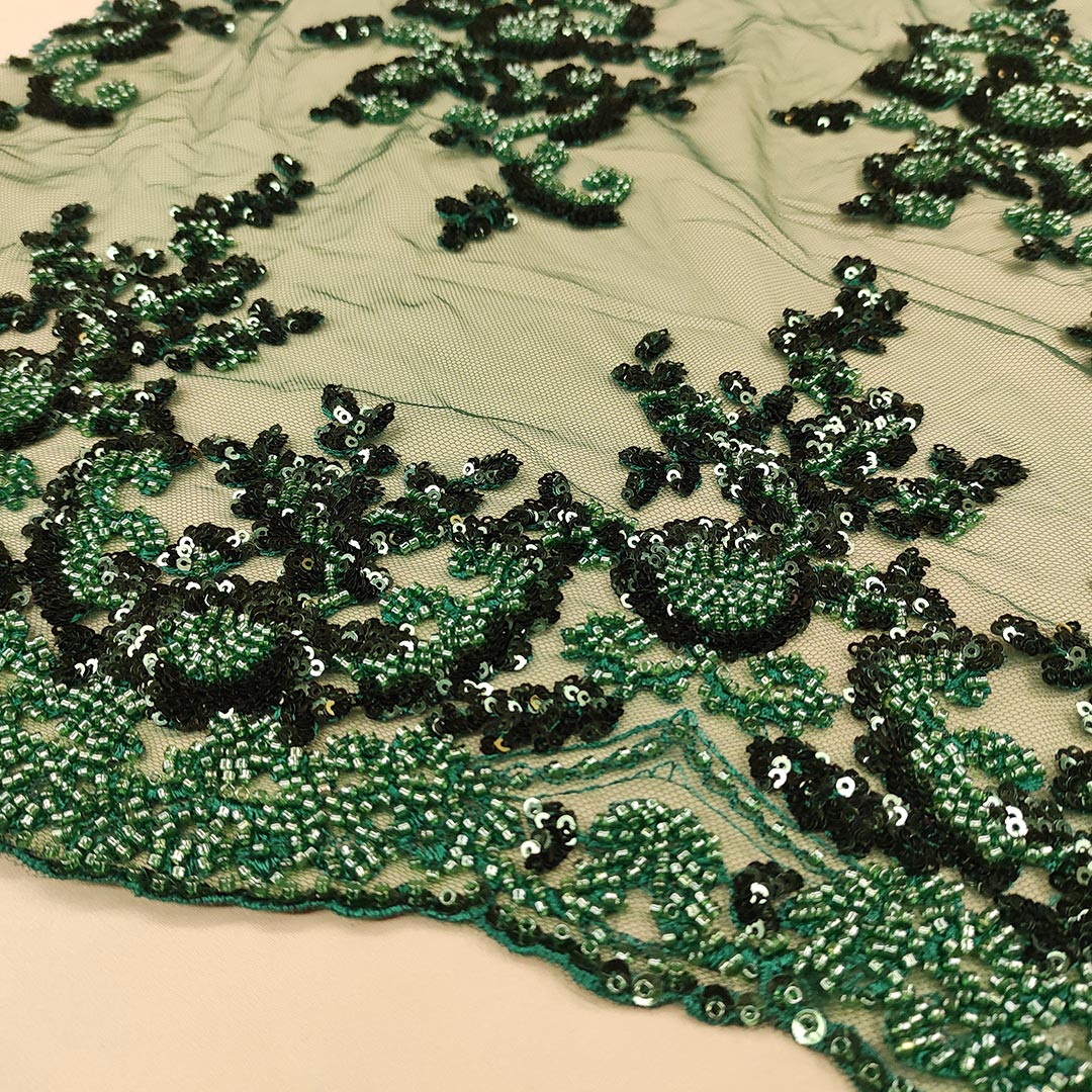 Tessuto Tulle mano seta doppio smerlo ricamato con paillettes e con perline motivo floreale verde bottiglia