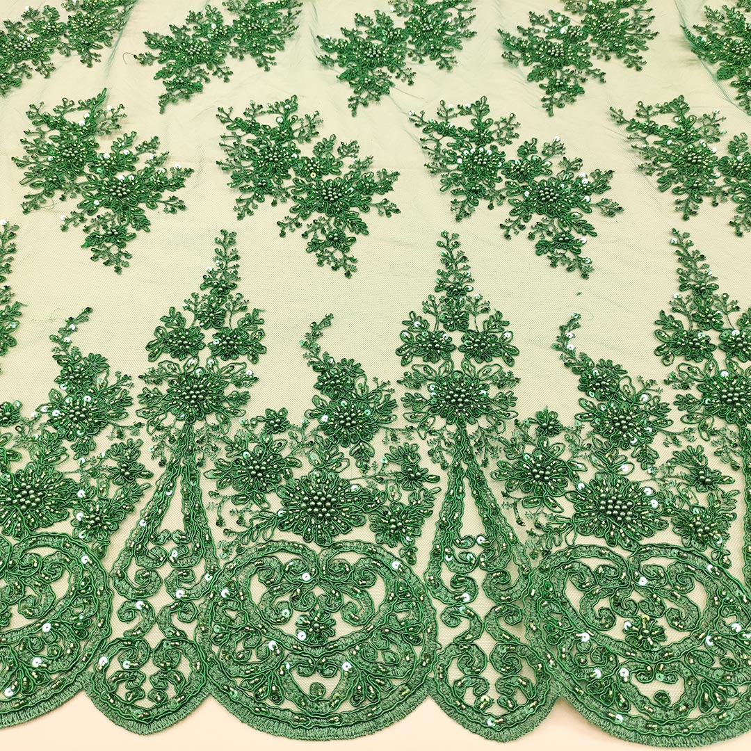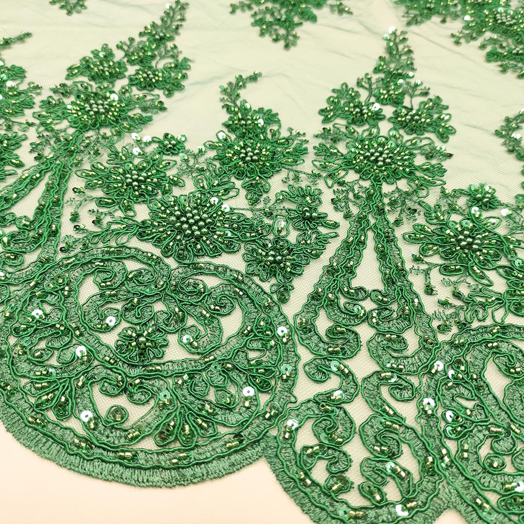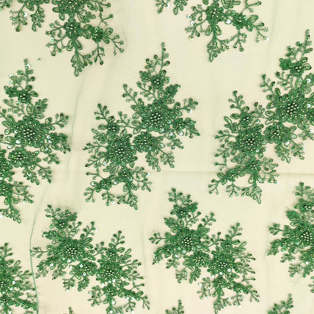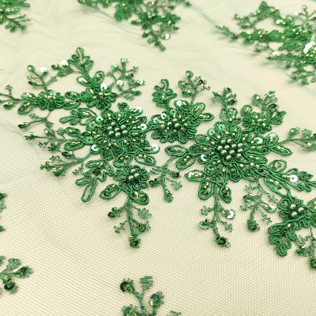 Tessuto Tulle mano seta doppio smerlo ricamato con paillettes e con perline motivo floreale verde prato