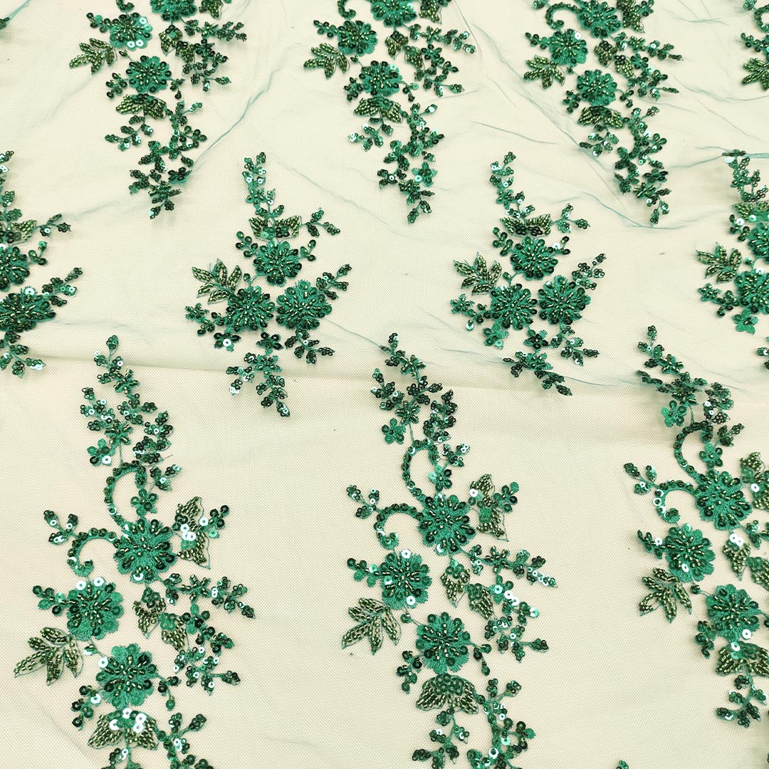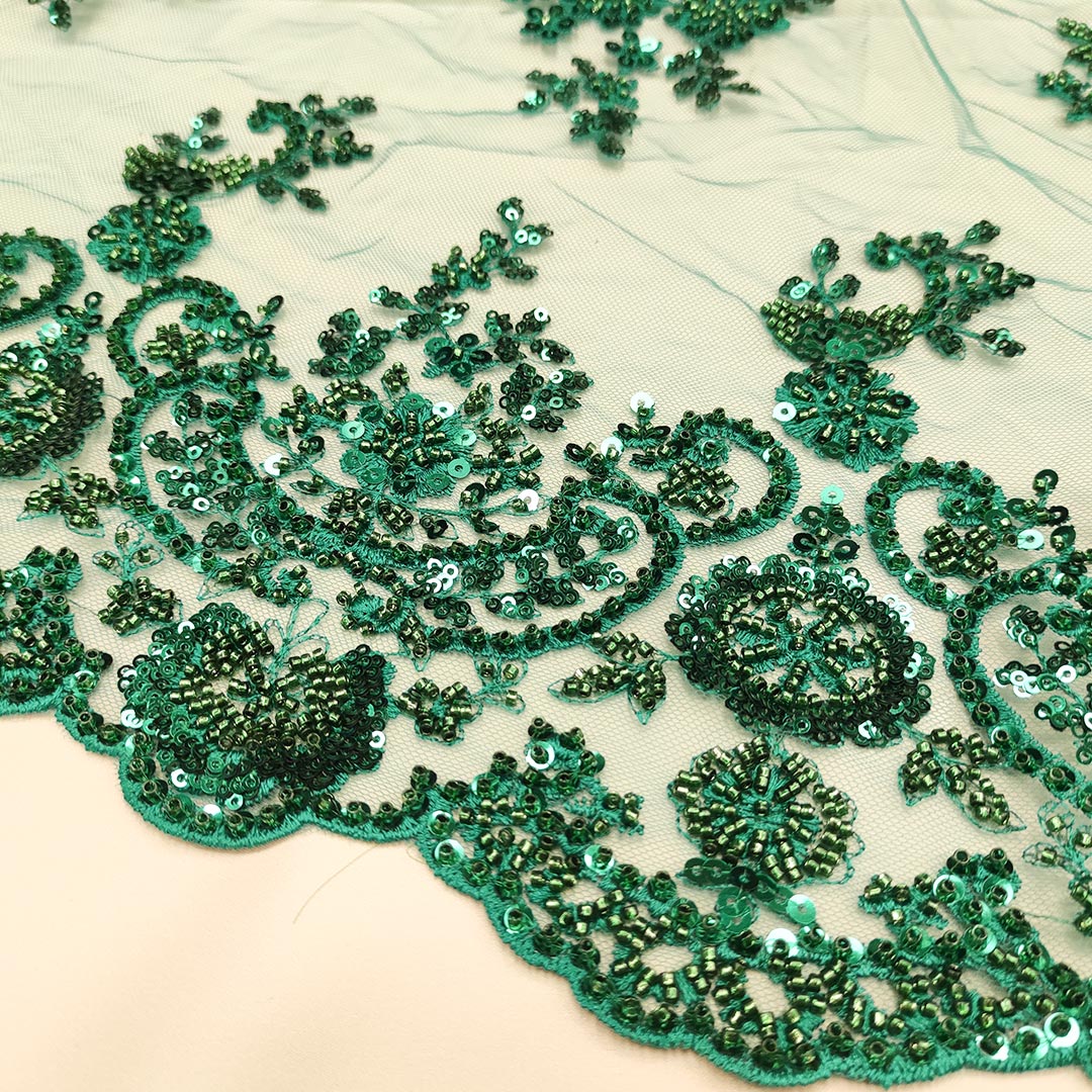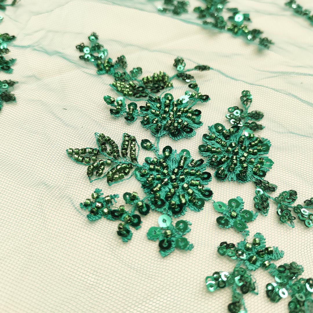 Tessuto Tulle mano seta doppio smerlo ricamato con paillettes e con perline motivo floreale verde smeraldo