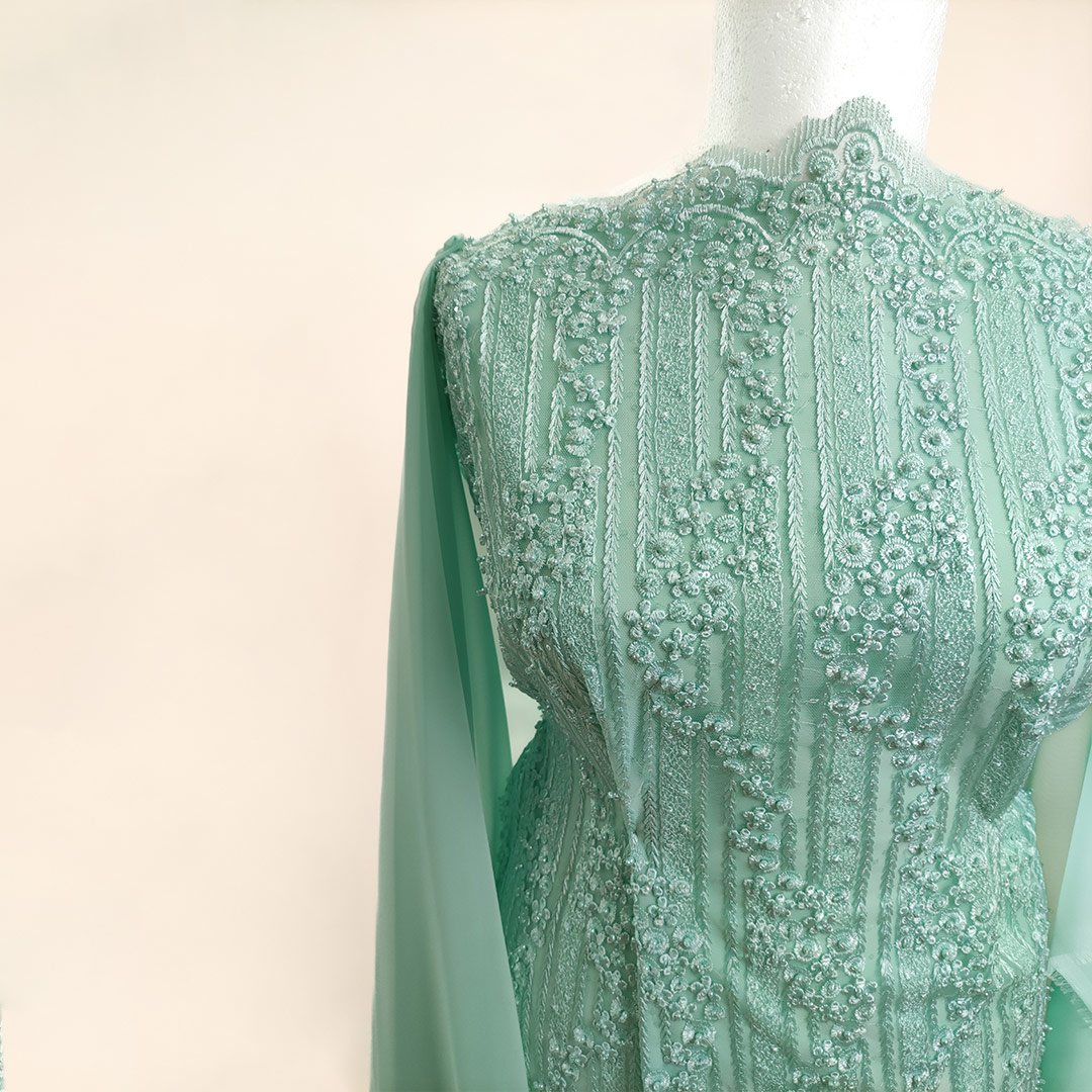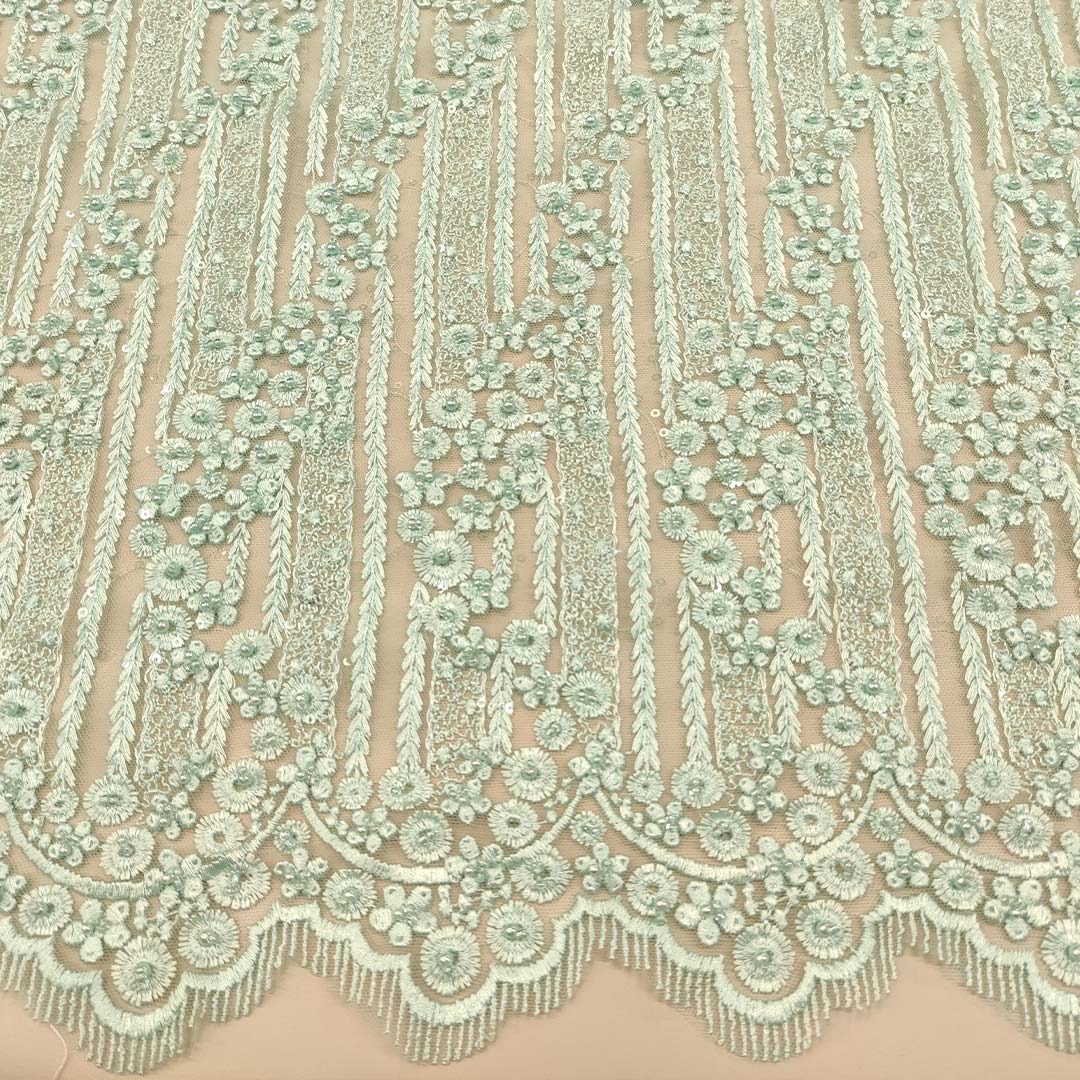 Tessuto tulle mano seta – pizzo ricamato con pietre motivo astratto verde tiffany