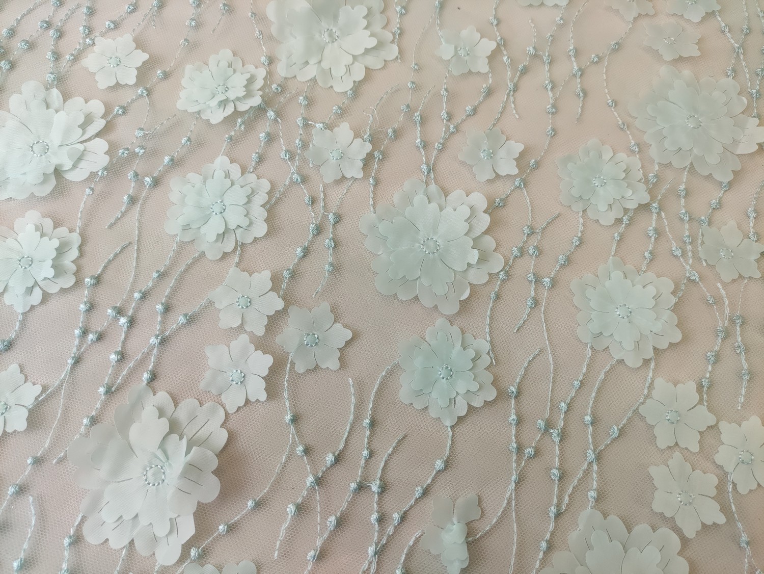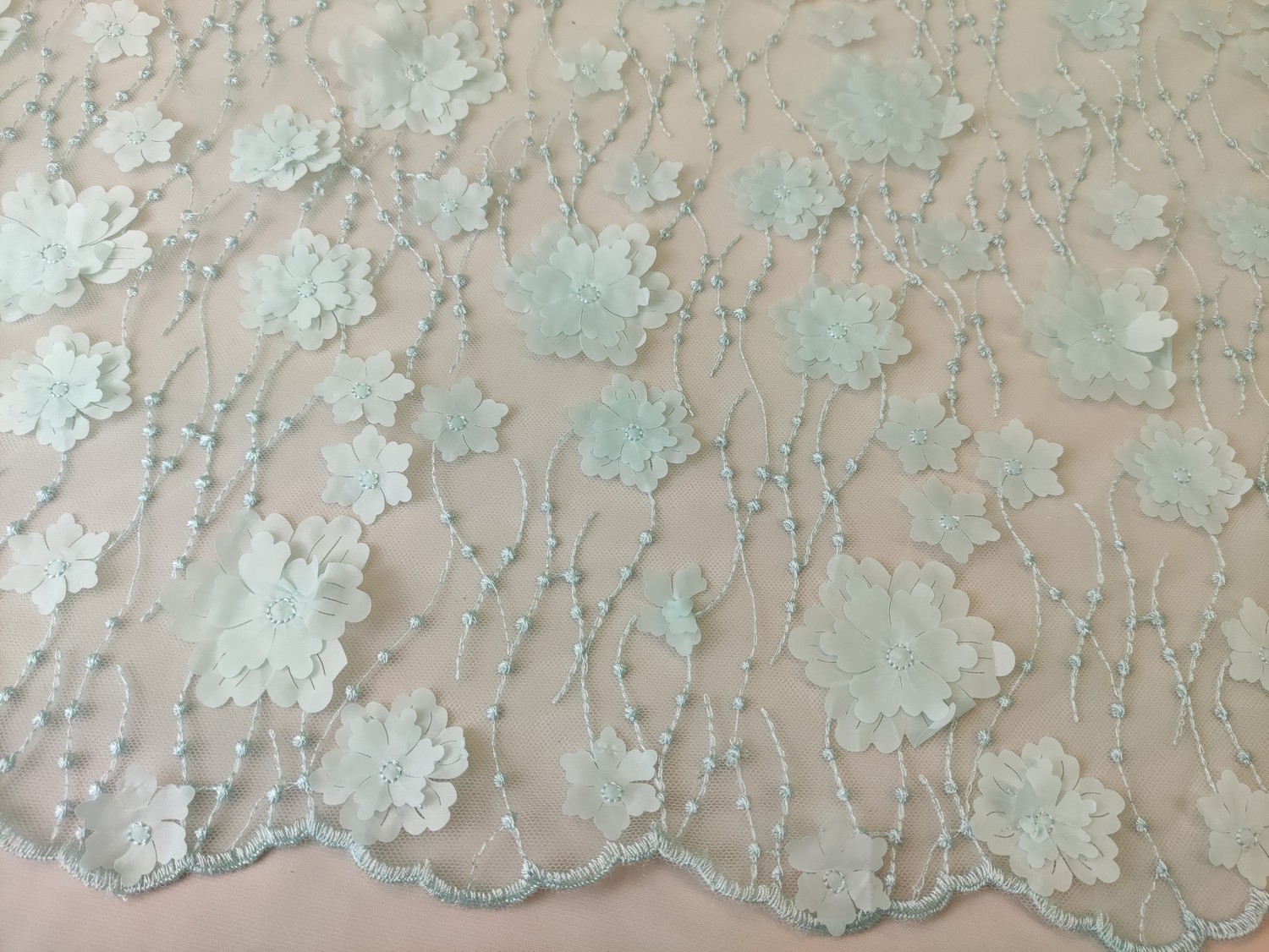 Tessuto Tulle mano seta ricamato con fiori in 3D acquamarina