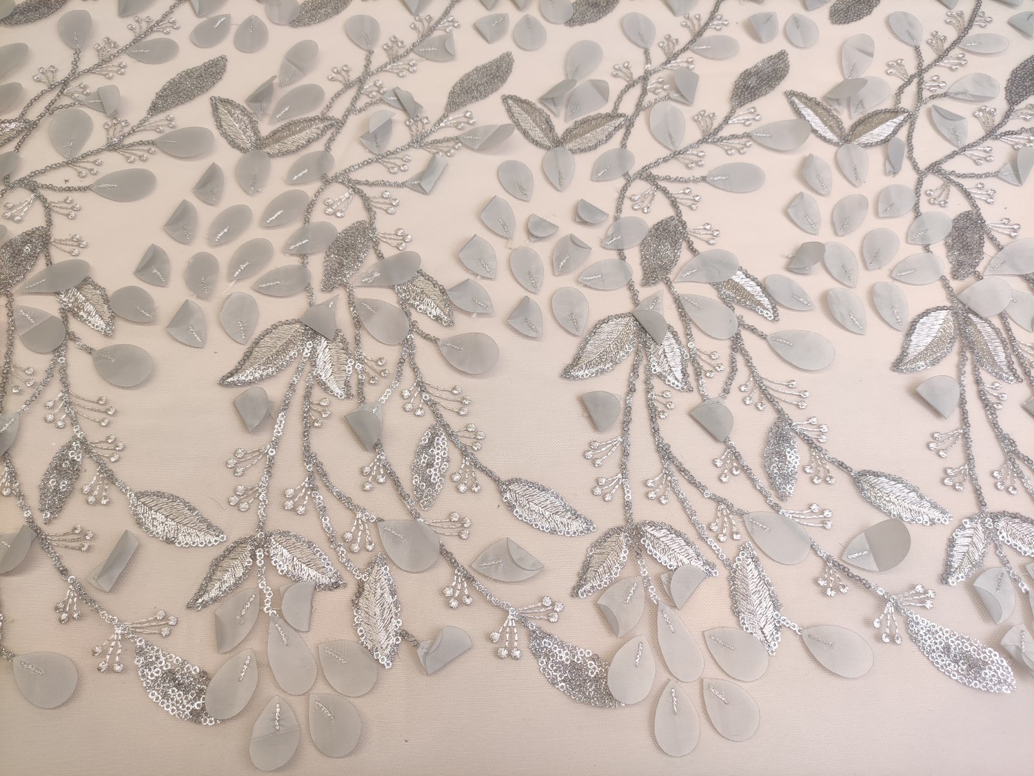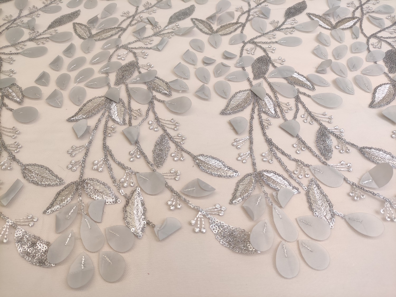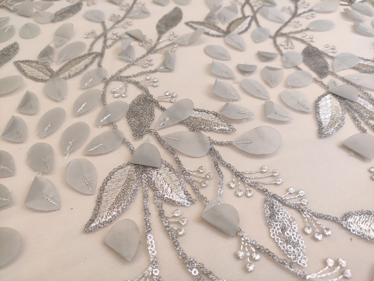 Tessuto Tulle mano seta ricamato con fiori in 3D argento