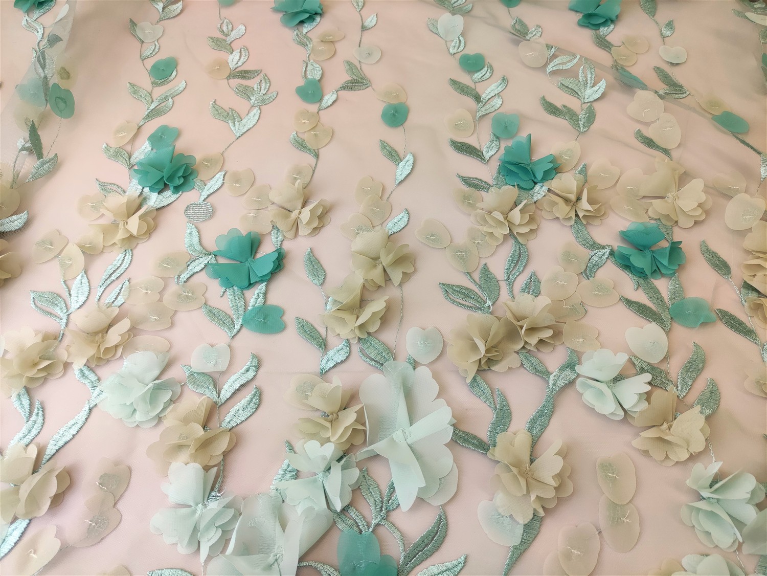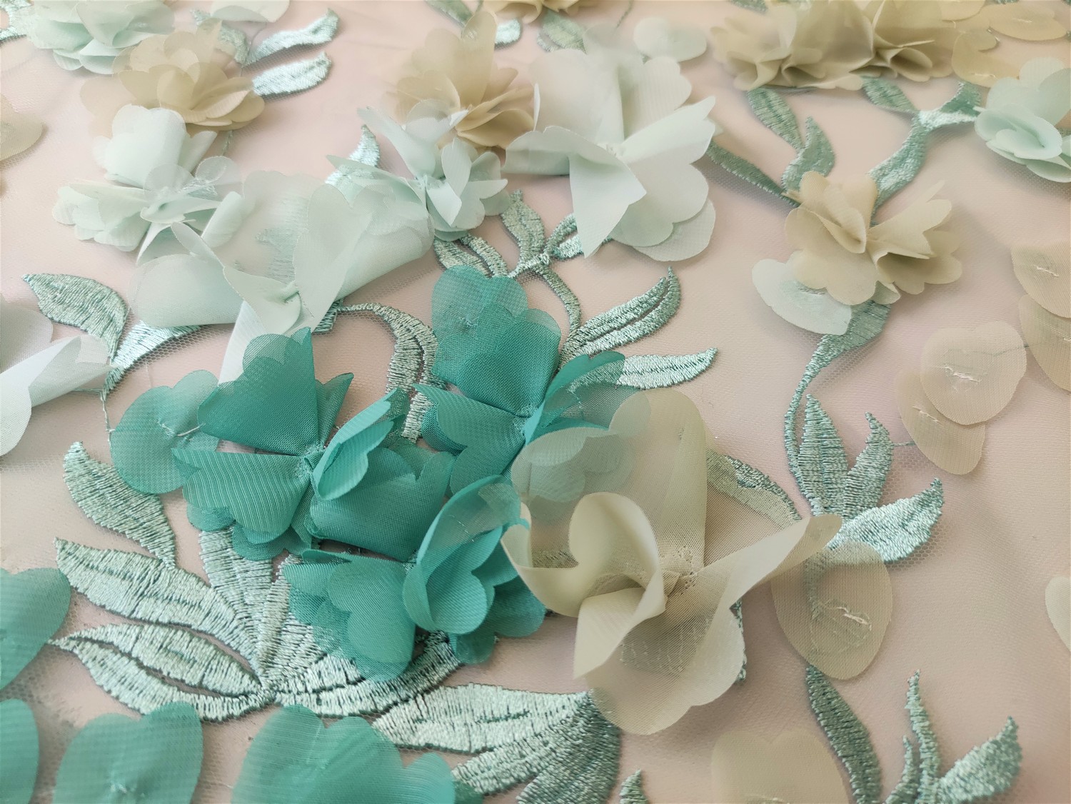 Tessuto Tulle mano seta ricamato con fiori in 3D beige – acquamarina – verde tiffany