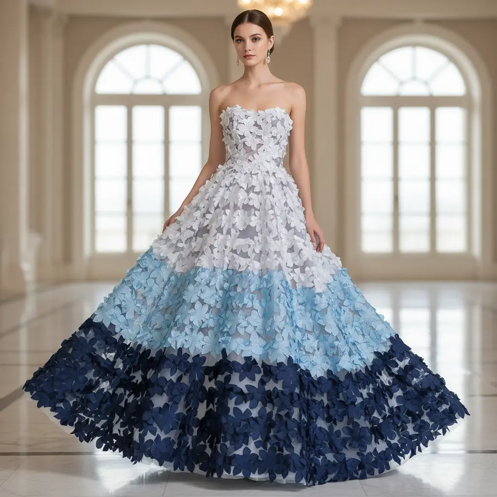 Tessuto Tulle mano seta ricamato con fiori in 3D bianco – celeste – blu