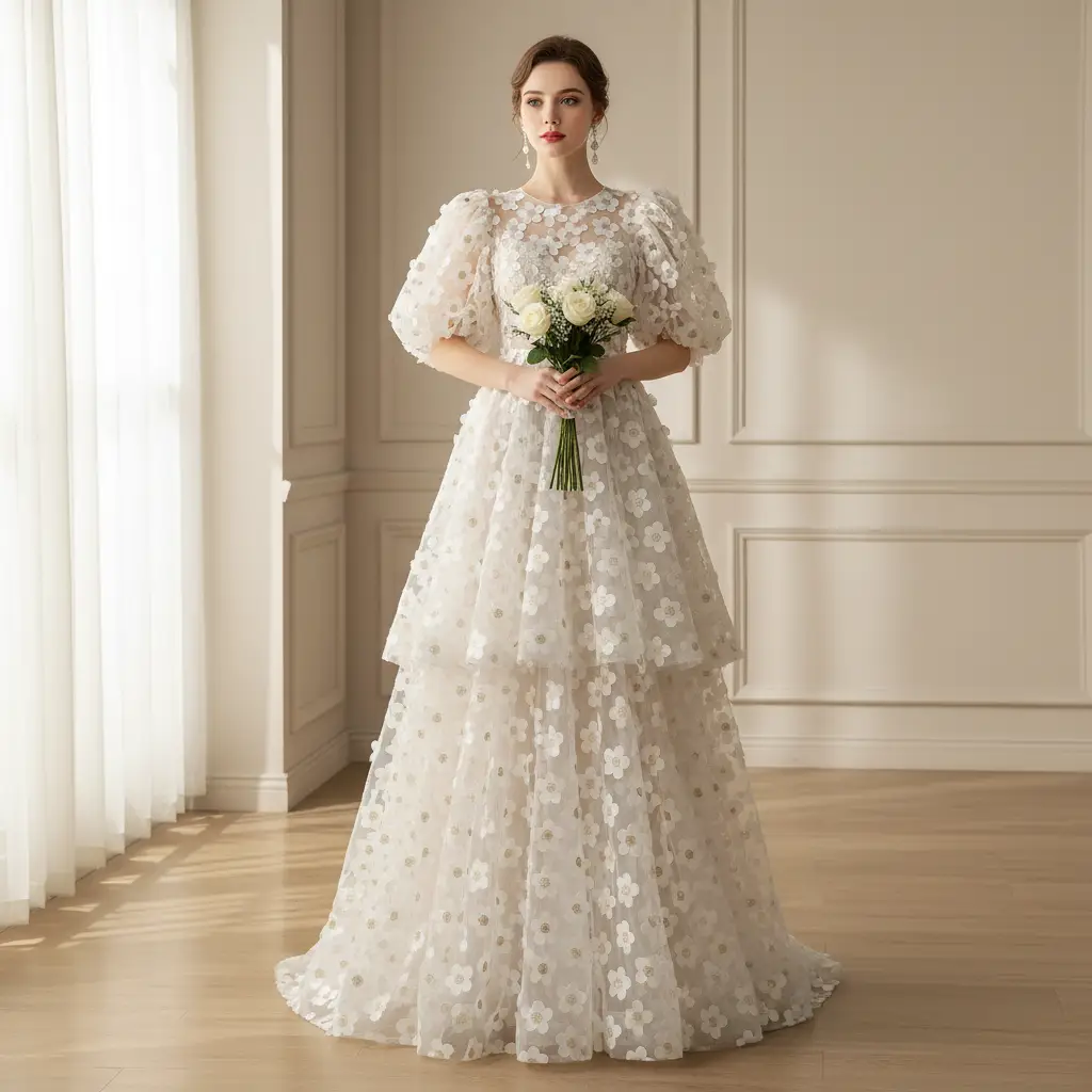 Tessuto Tulle mano seta ricamato con fiori in 3D dalla mano morbida, voluminosa e fluente, ideale per creare capi sartoriali da cerimonia e per le grandi occasioni originali e alla moda.