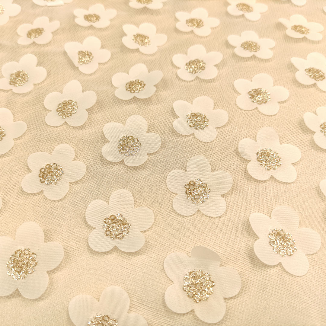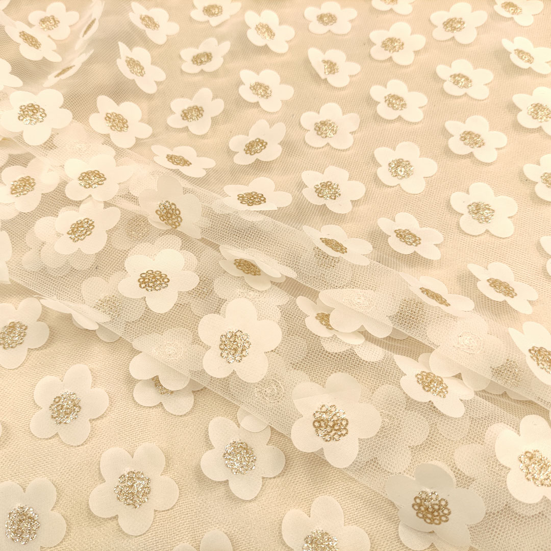 Tessuto Tulle mano seta ricamato con fiori in 3D bianco – oro