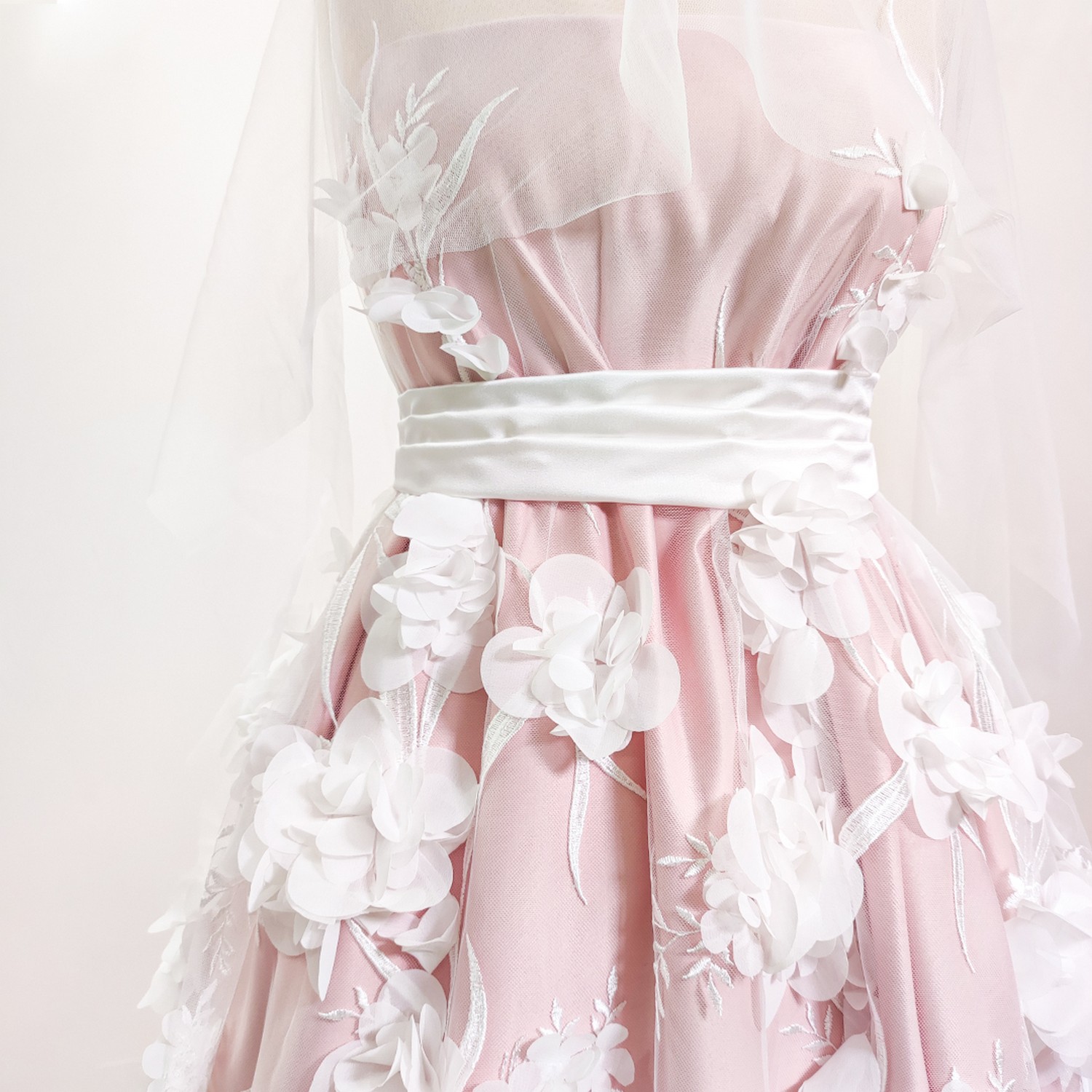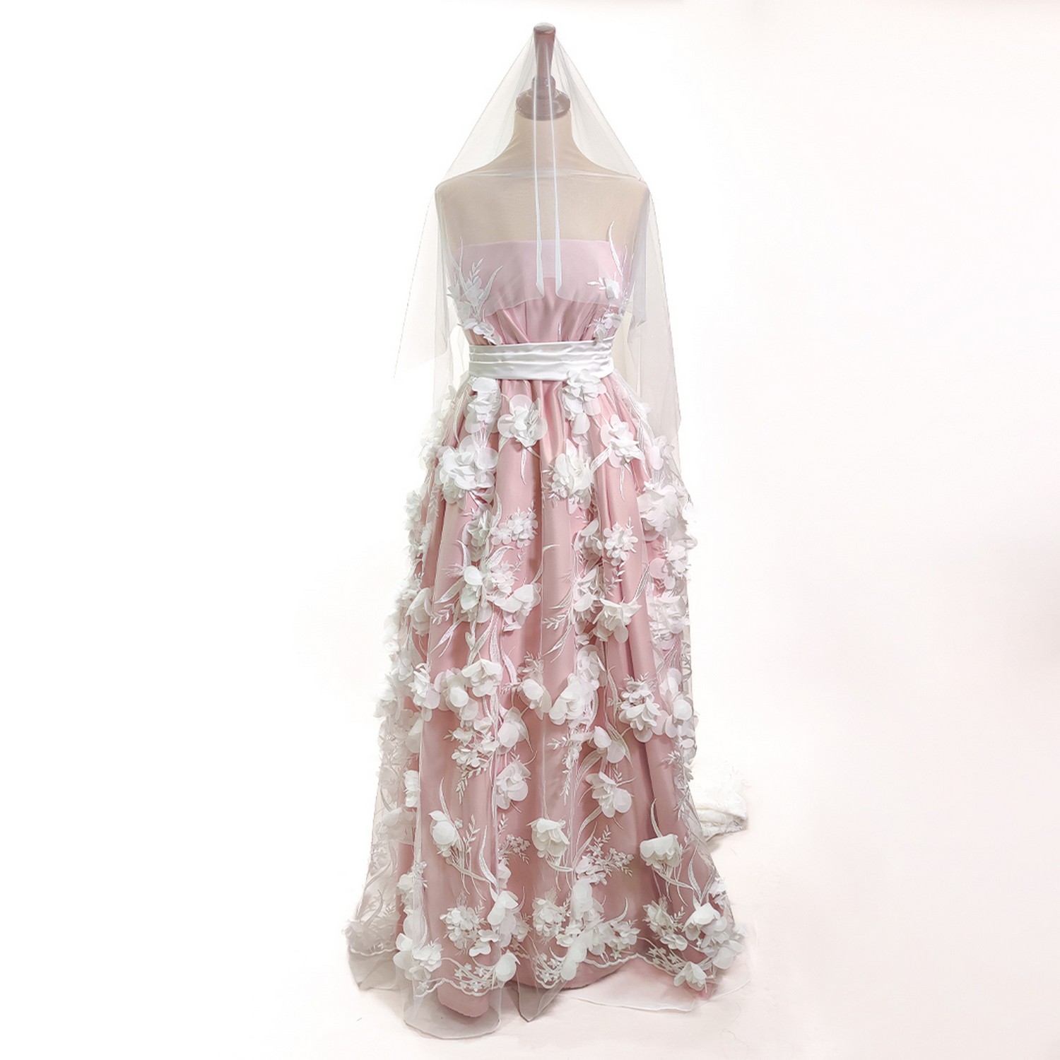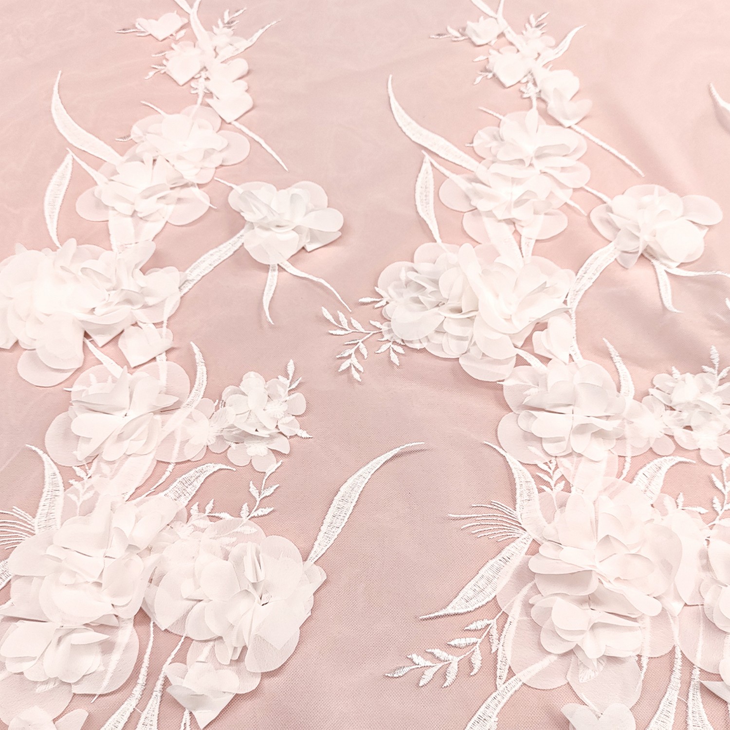 Tessuto Tulle mano seta ricamato con fiori in 3D bianco seta