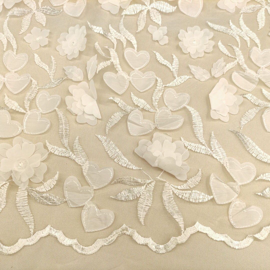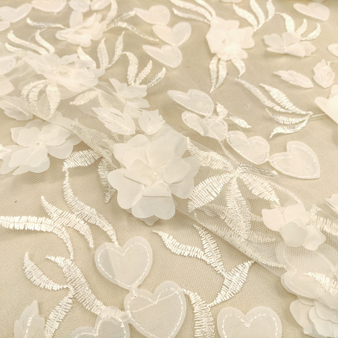 Tessuto Tulle mano seta ricamato con fiori in 3D bianco