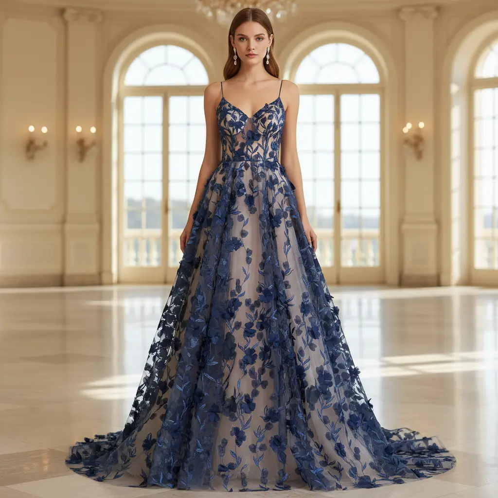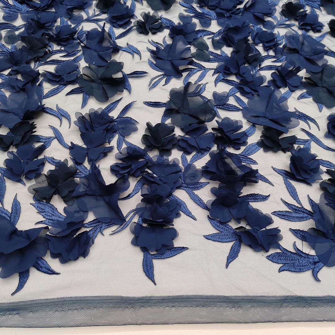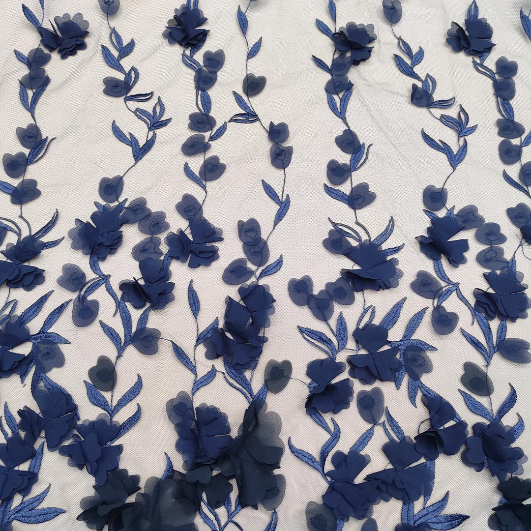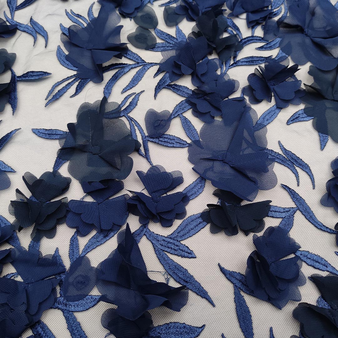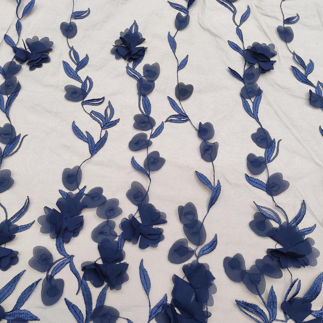 Tessuto Tulle mano seta ricamato con fiori in 3D blu
