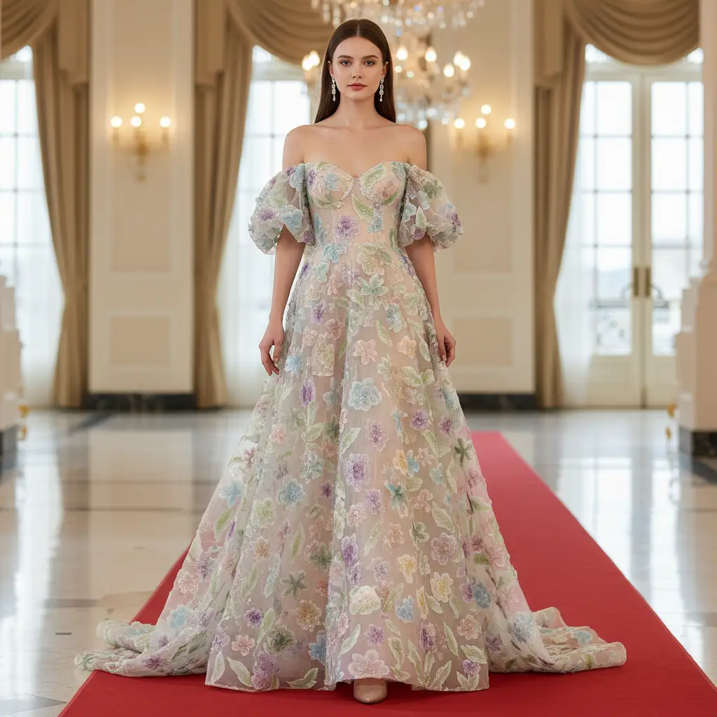 Tessuto Tulle mano seta ricamato con fiori in 3D dalla mano morbida, voluminosa e fluente, ideale per creare capi sartoriali da cerimonia e per le grandi occasioni originali e alla moda.