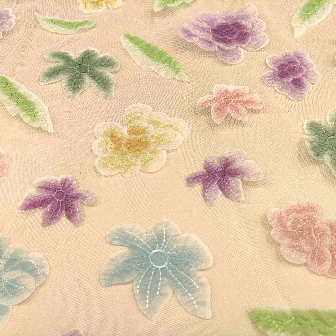 Tessuto Tulle mano seta ricamato con fiori in 3D celeste – verde – viola