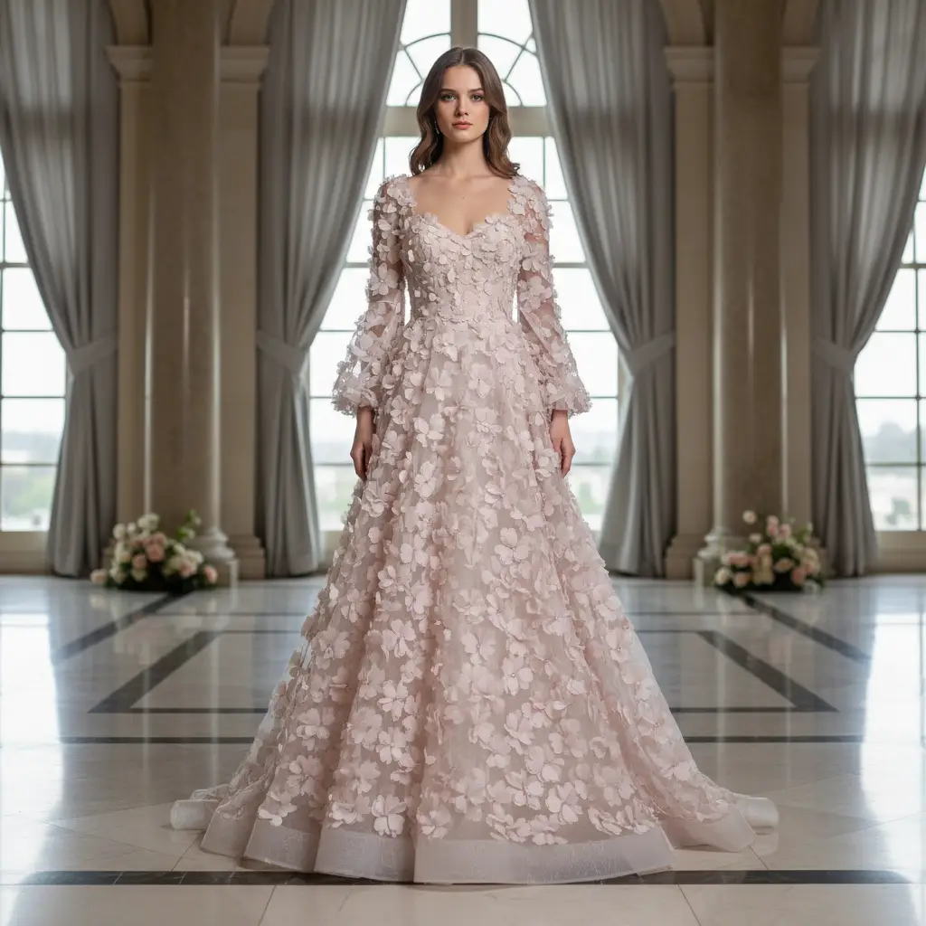 Tessuto Tulle mano seta ricamato con fiori in 3D e con cristalli dalla mano morbida, voluminosa e fluente, ideale per creare capi sartoriali da cerimonia e per le grandi occasioni originali e alla moda.