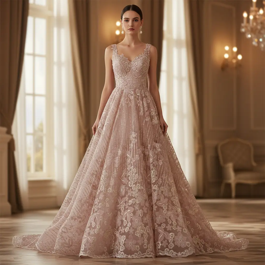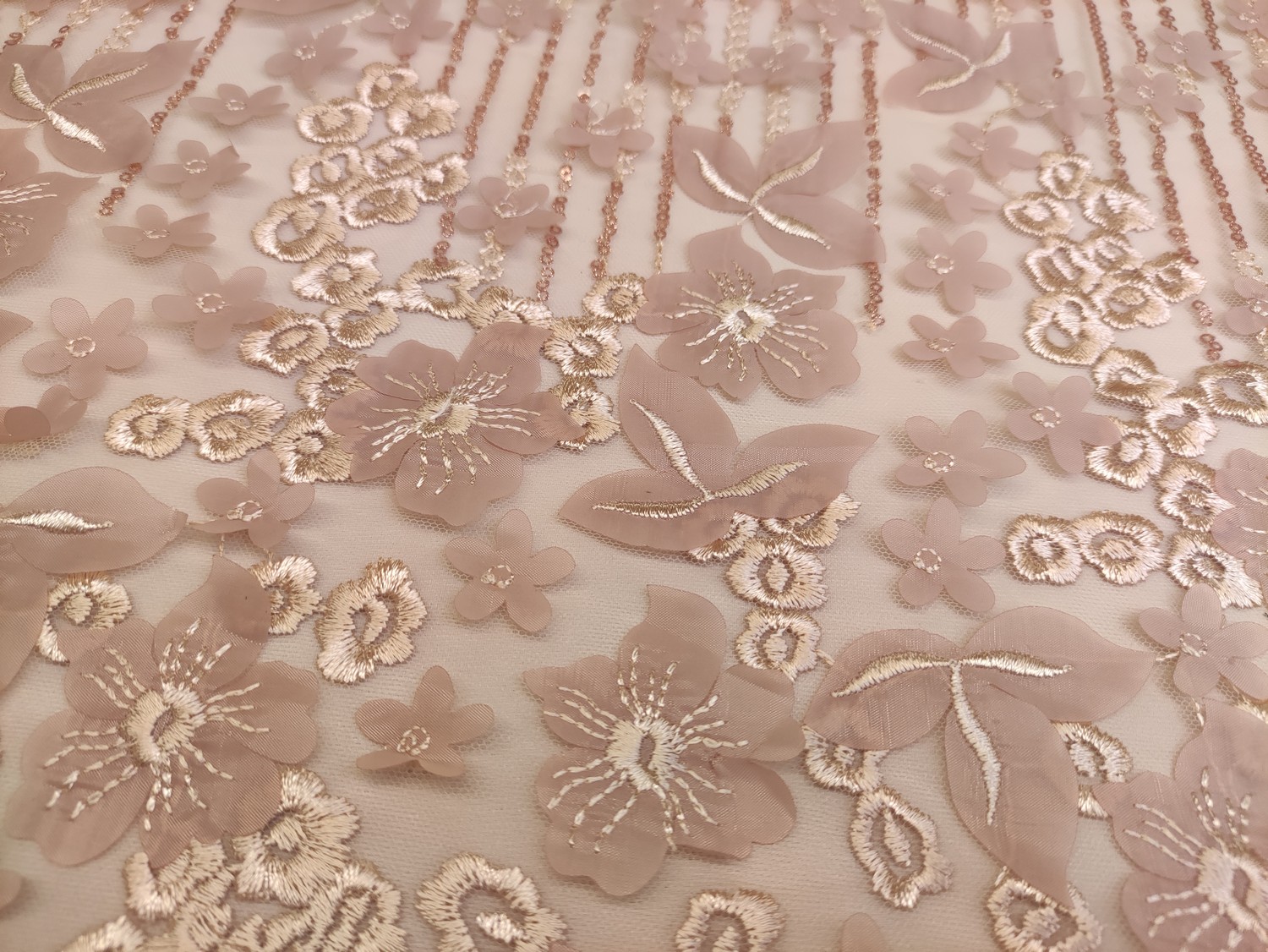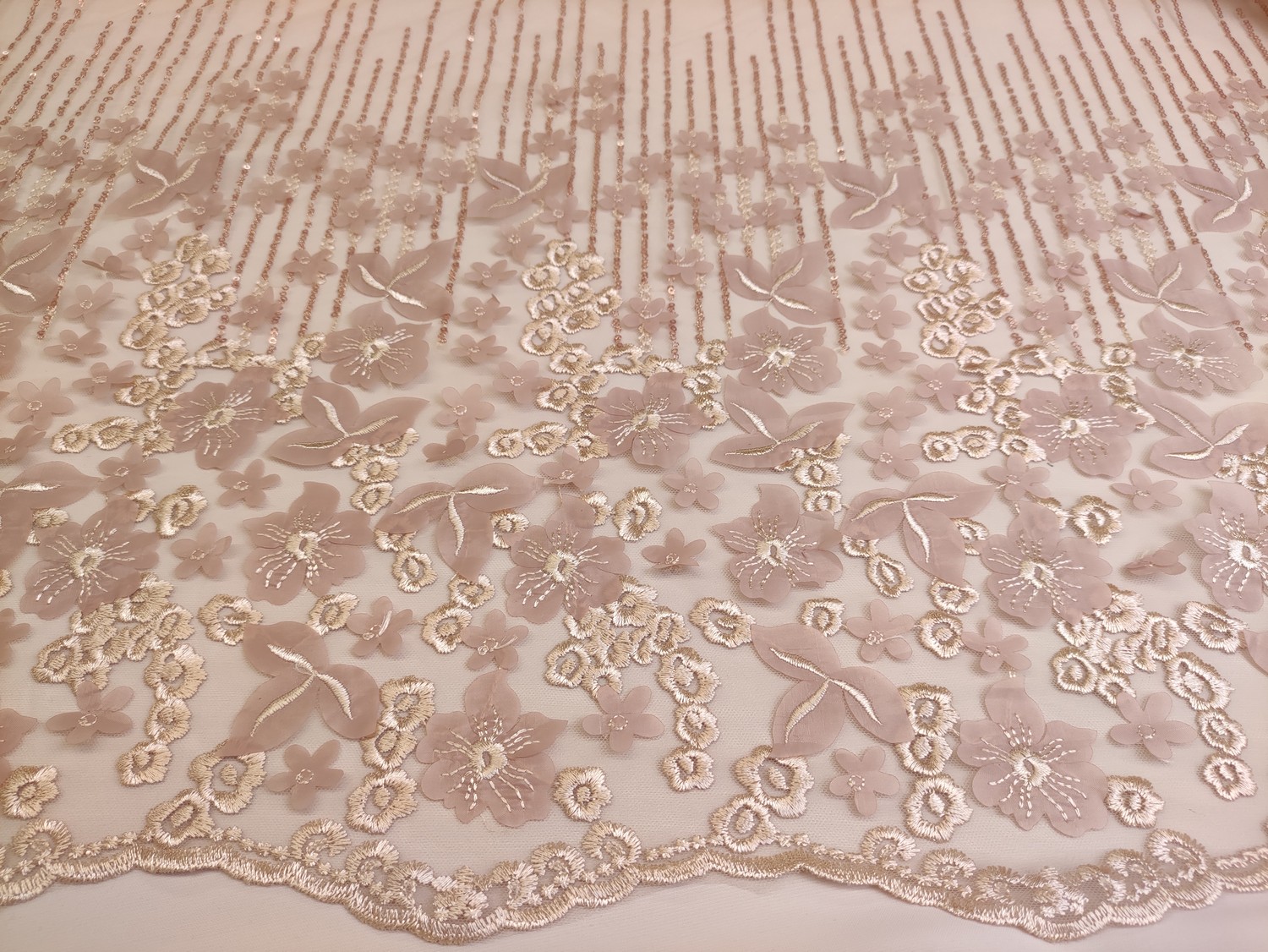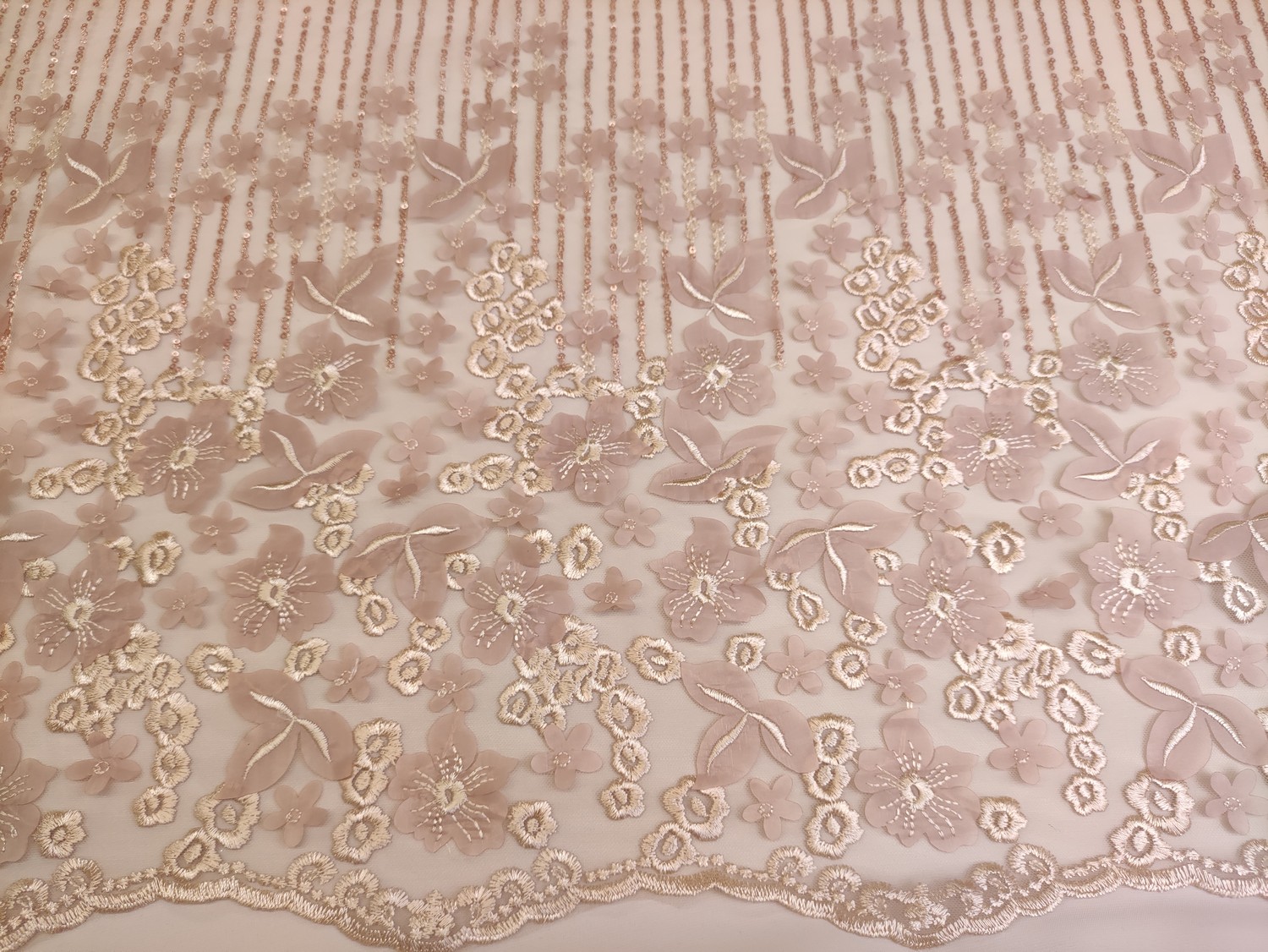 Tessuto Tulle mano seta ricamato con fiori in 3D e paillettes rosa – beige