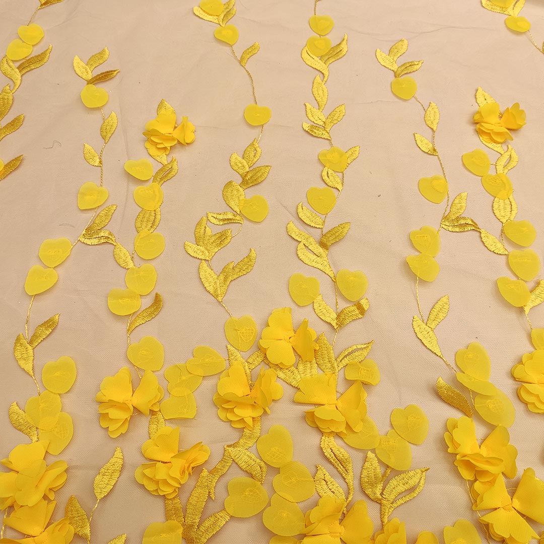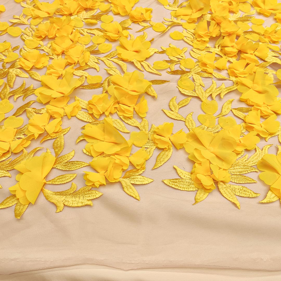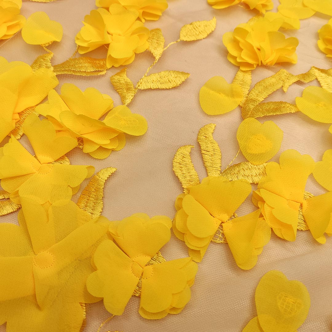 Tessuto Tulle mano seta ricamato con fiori in 3D giallo