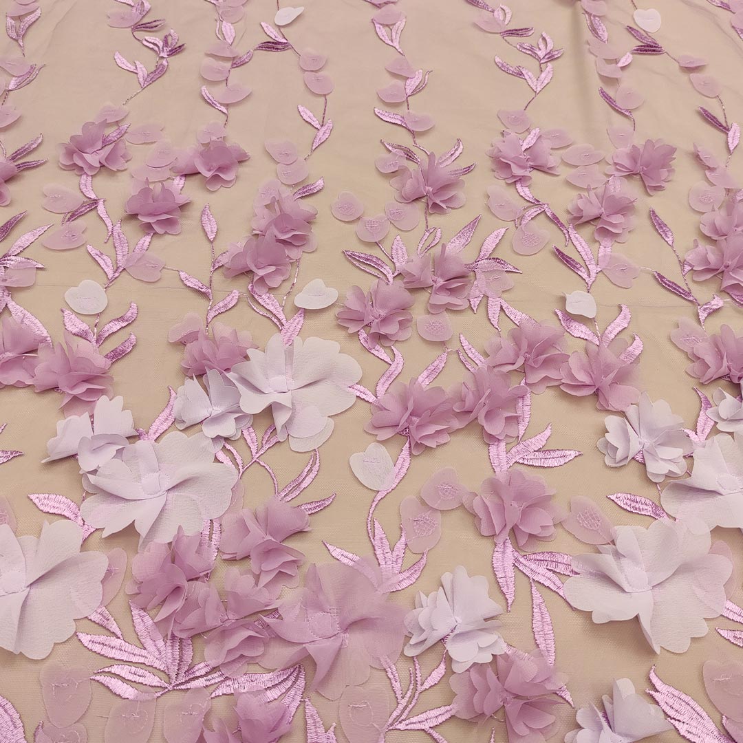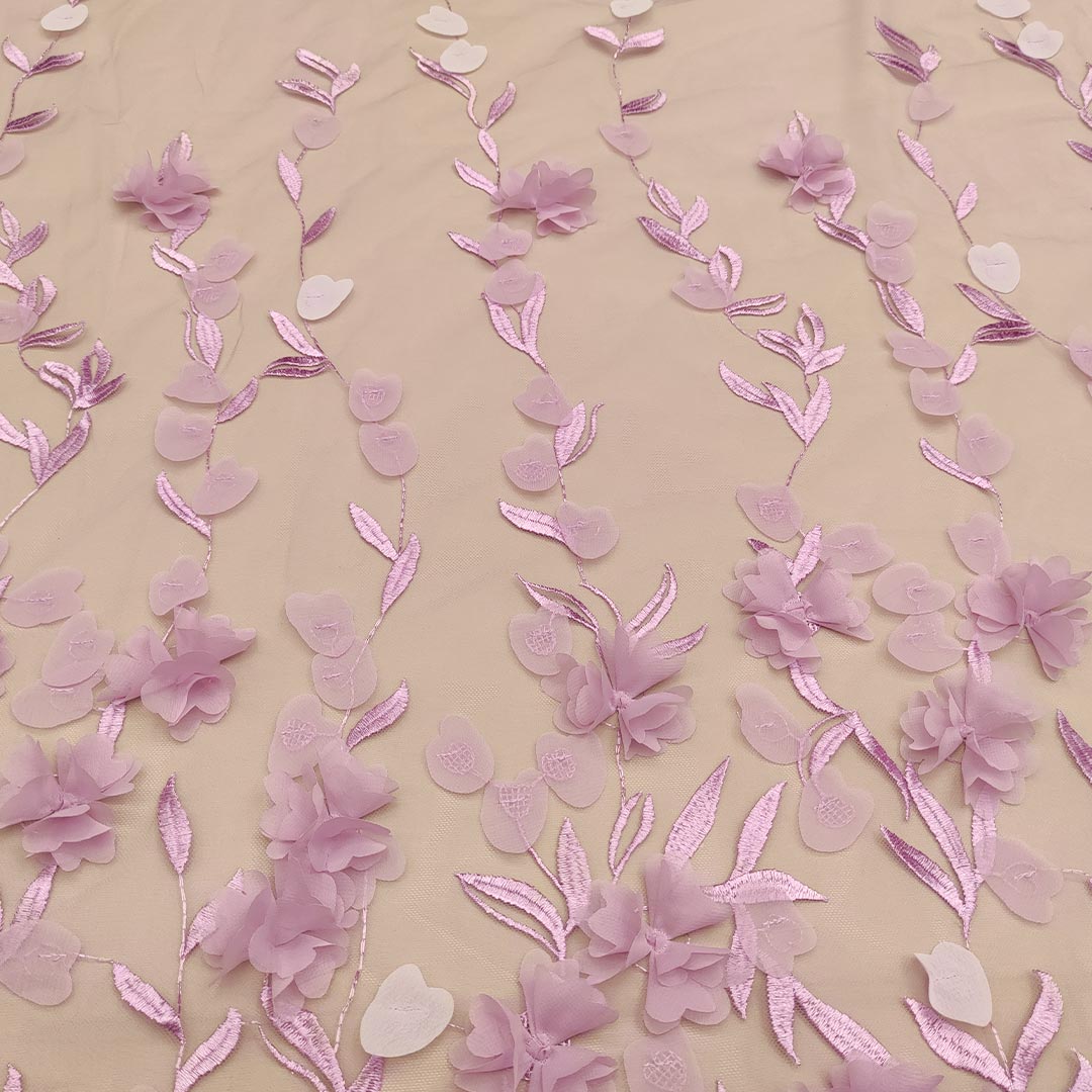 Tessuto Tulle mano seta ricamato con fiori in 3D glicine – lilla
