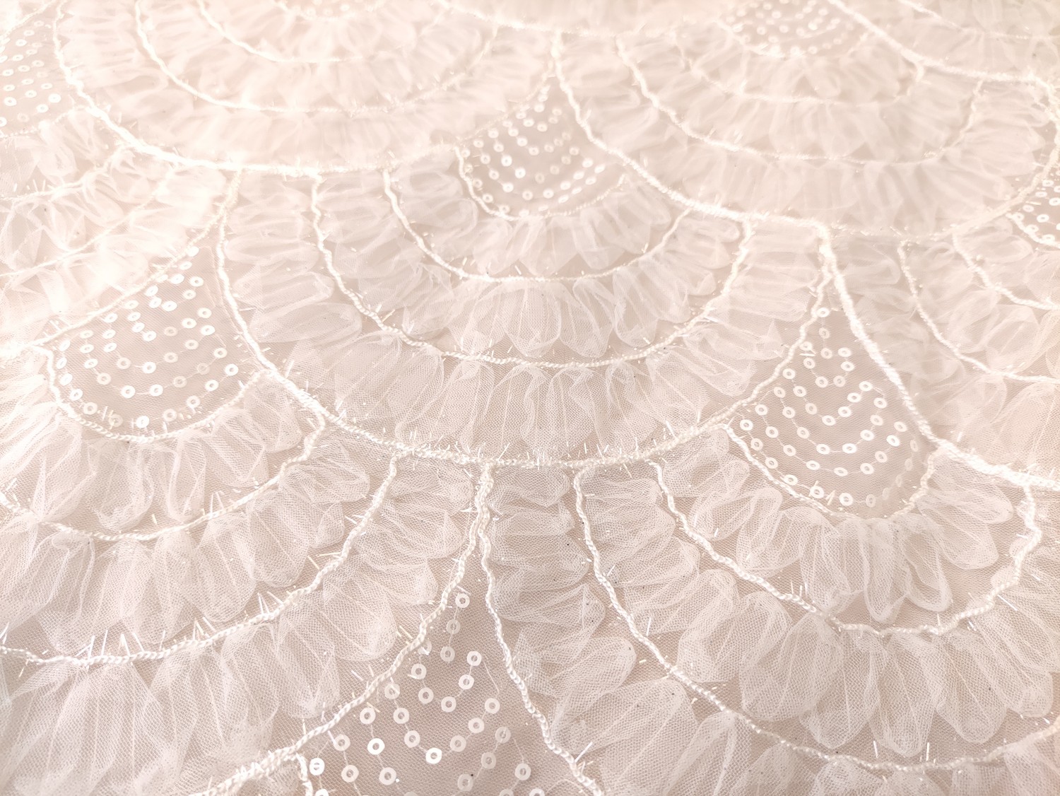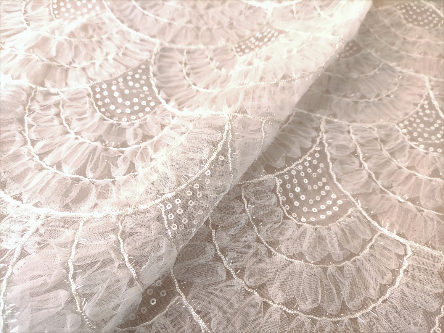 Tessuto Tulle mano seta ricamato dalla mano morbida, voluminosa e fluente, ideale per creare capi sartoriali da cerimonia e per le grandi occasioni originali e alla moda.