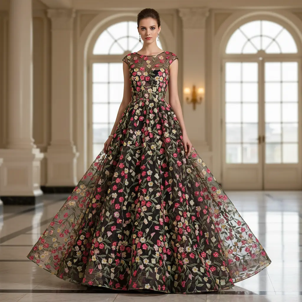 Tessuto Tulle mano seta base nero ricamato con fiori in 3D dalla mano morbida, voluminosa e fluente, ideale per creare capi sartoriali da cerimonia e per le grandi occasioni originali e alla moda.