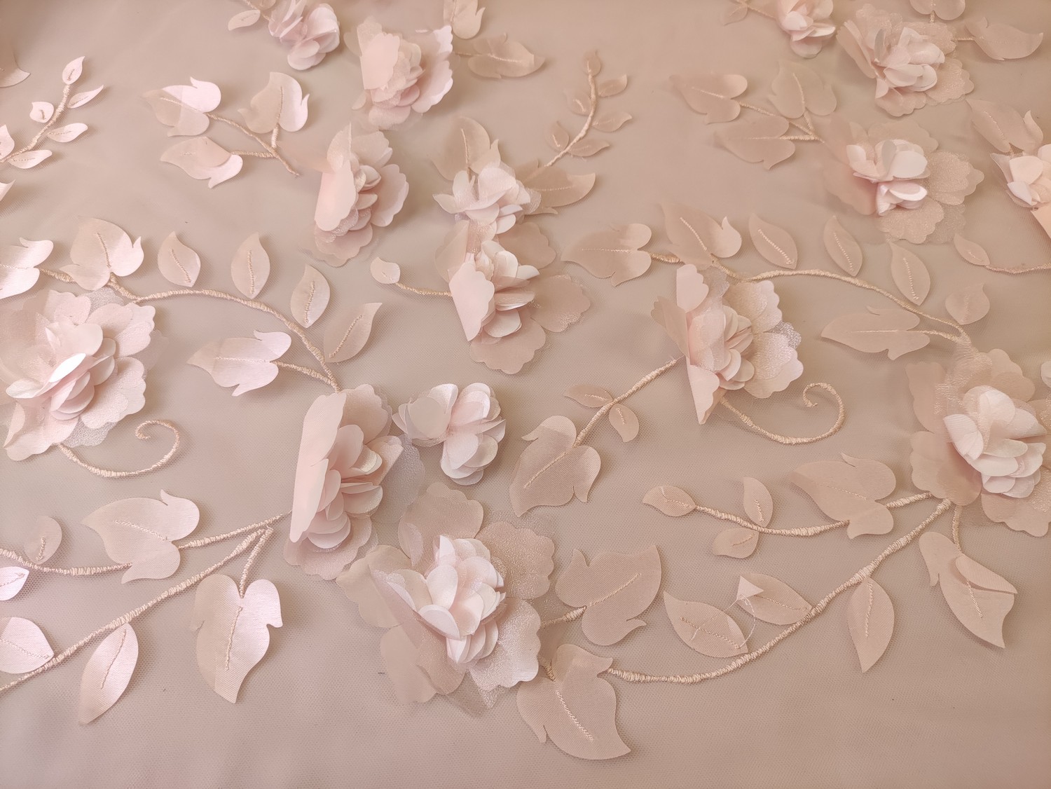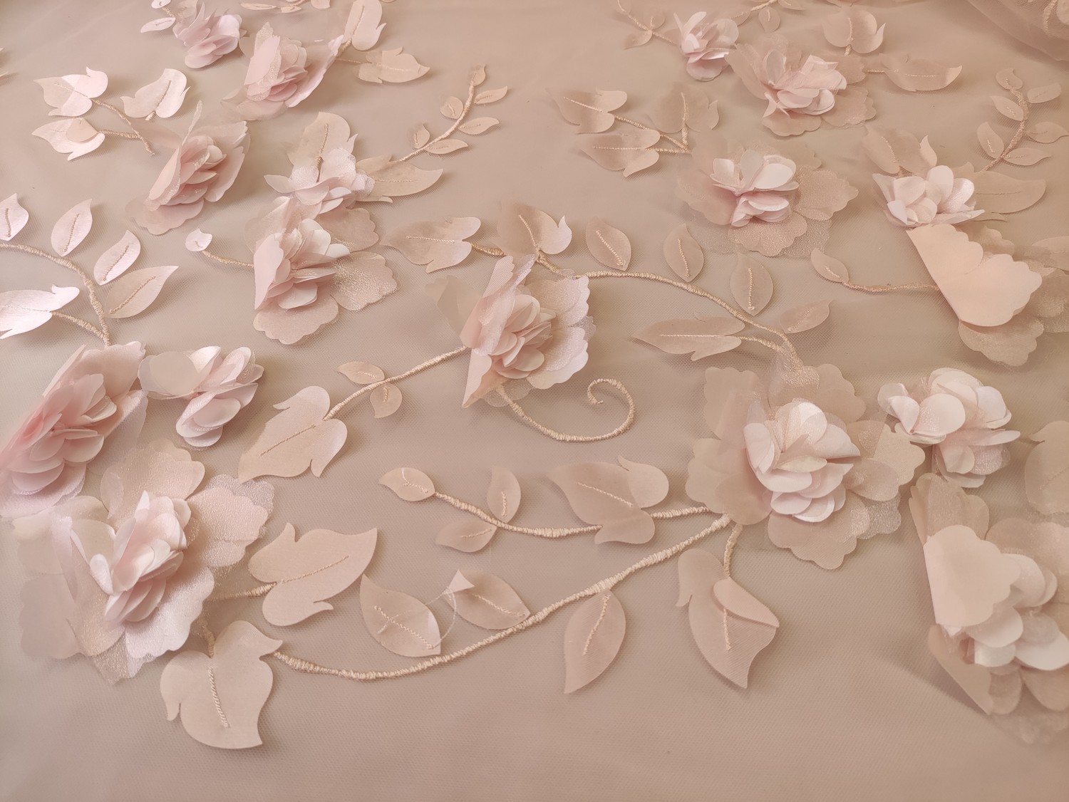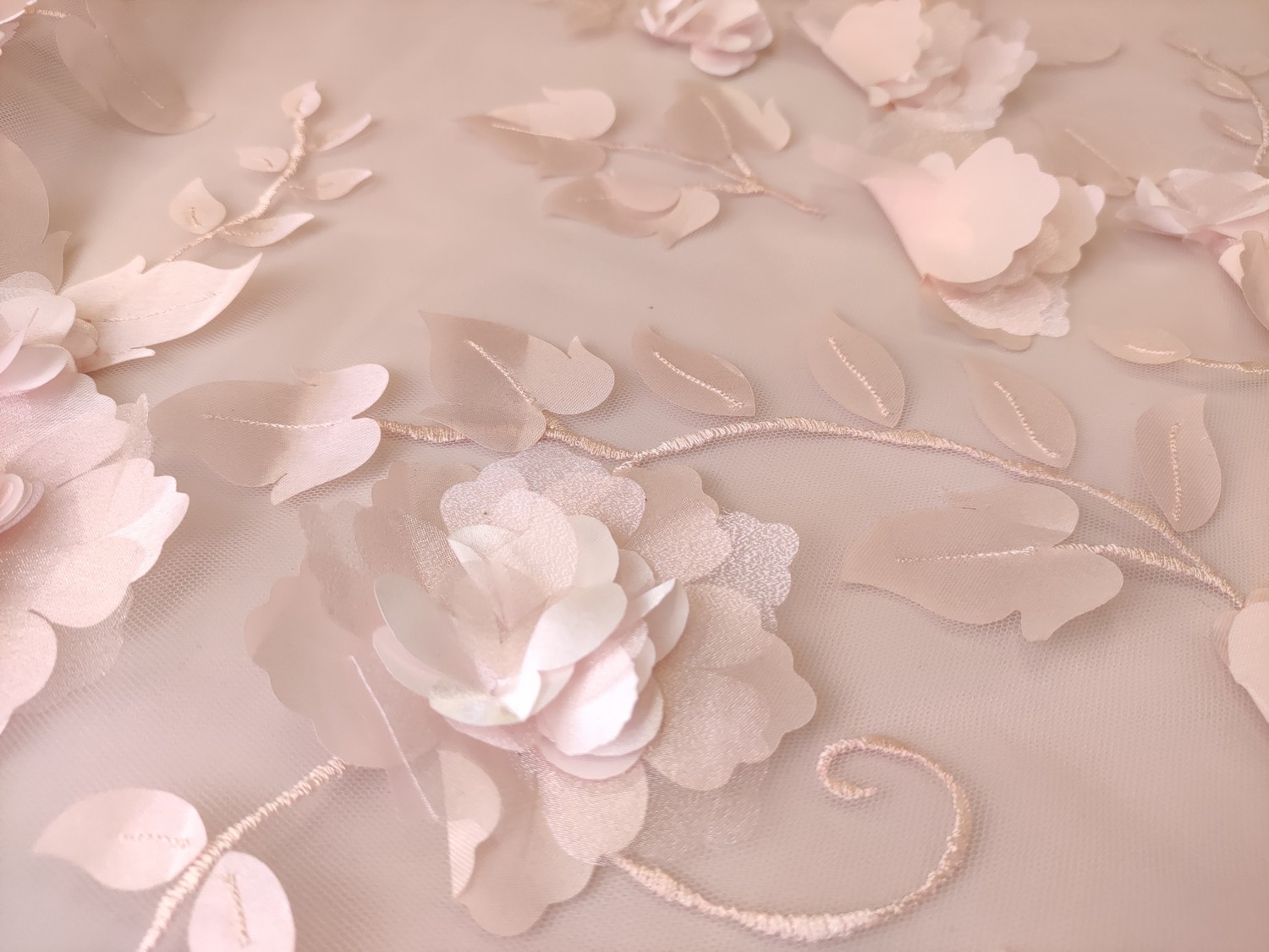 Tessuto Tulle mano seta ricamato con fiori in 3D dalla mano morbida, voluminosa e fluente, ideale per creare capi sartoriali da cerimonia e per le grandi occasioni originali e alla moda.