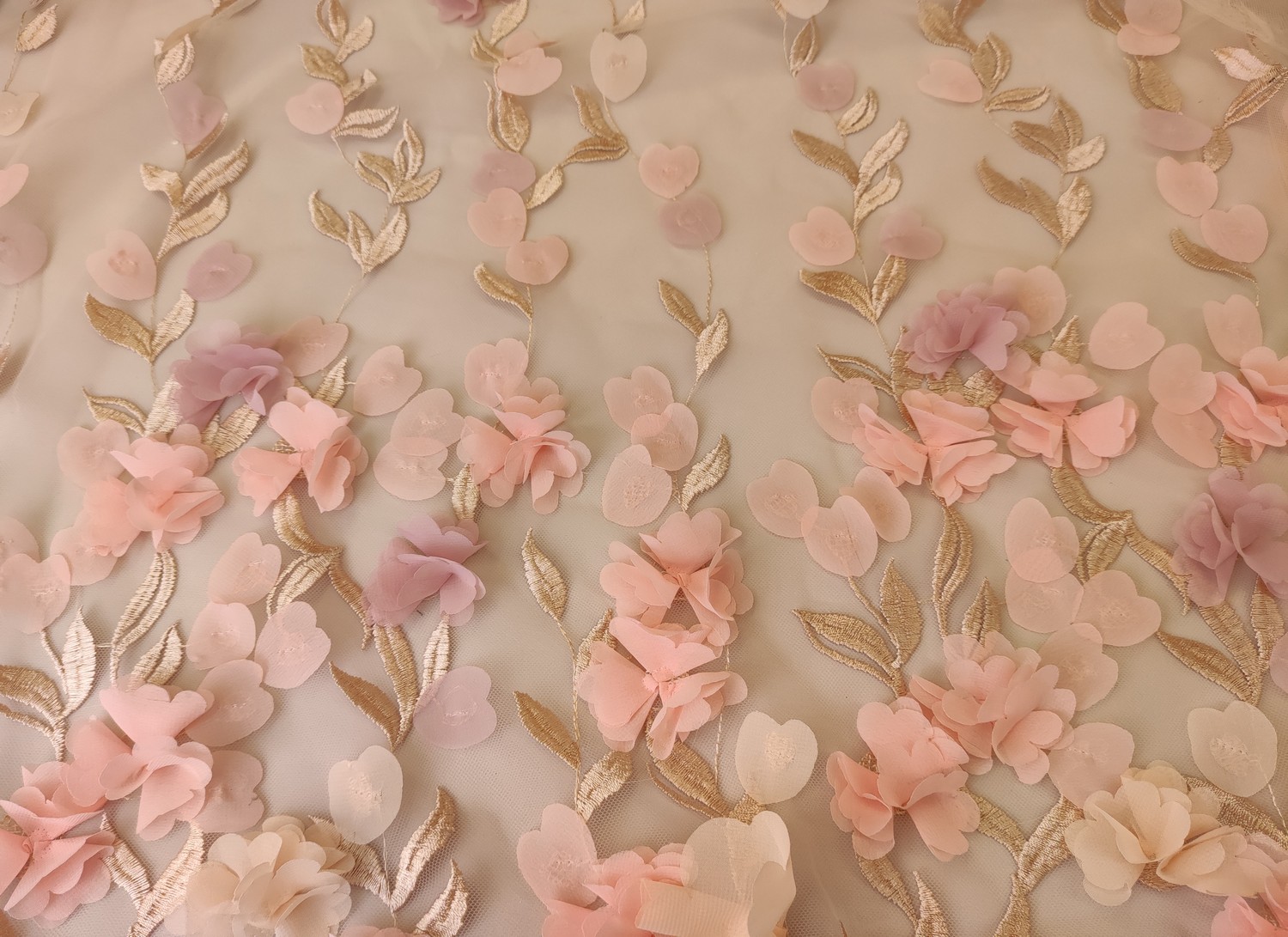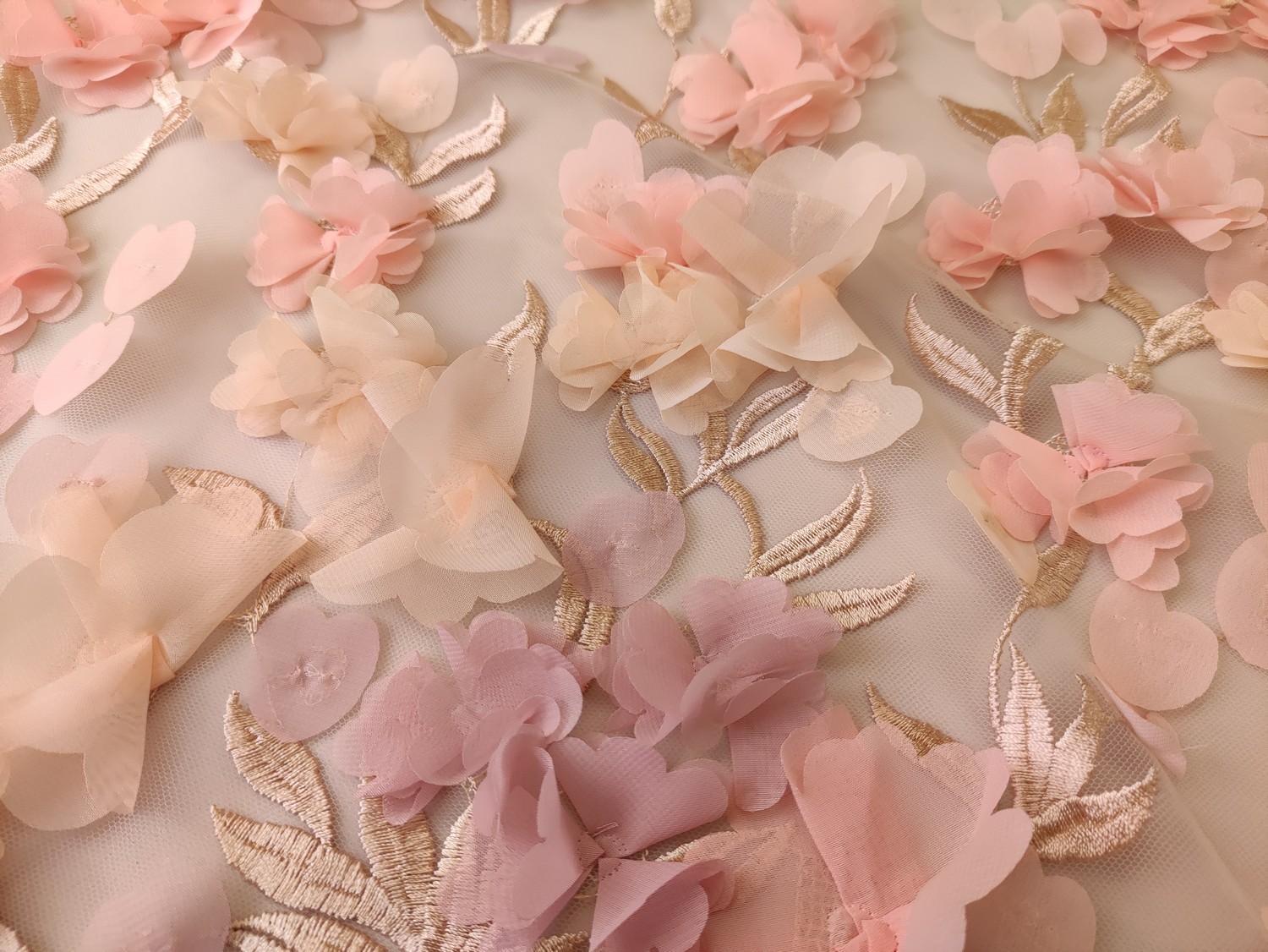 Tessuto Tulle mano seta ricamato con fiori in 3D rosa antico – pesca – beige